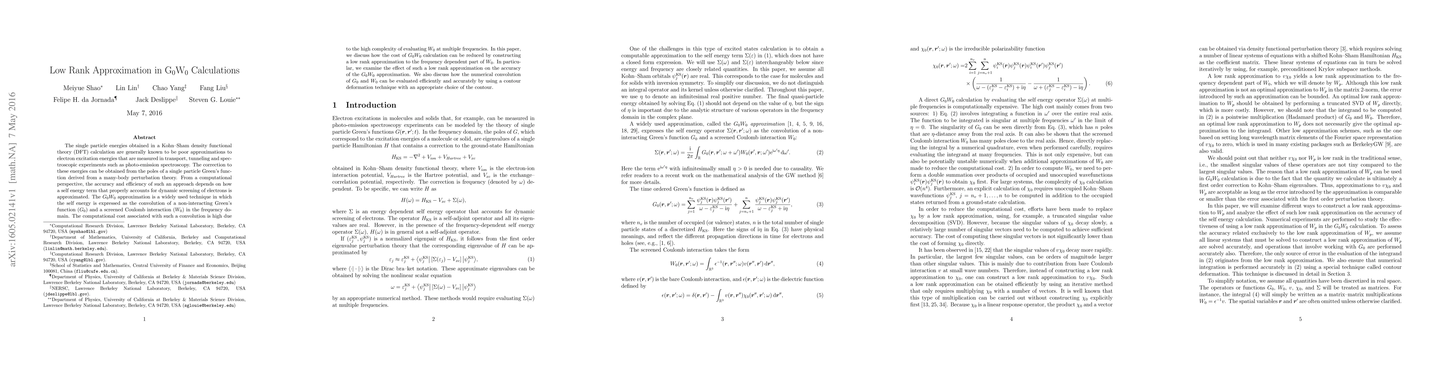 The single particle energies obtained in a Kohn--Sham density functional theory (DFT) calculation are generally known to be poor approximations to electron excitation energies that are measured in transport, tunneling and spectroscopic experiments such as photo-emission spectroscopy. The correction to these energies can be obtained from the poles of a single particle Green's function derived from a many-body perturbation theory. From a computational perspective, the accuracy and efficiency of such an approach depends on how a self energy term that properly accounts for dynamic screening of electrons is approximated. The $G_0W_0$ approximation is a widely used technique in which the self energy is expressed as the convolution of a non-interacting Green's function ($G_0$) and a screened Coulomb interaction ($W_0$) in the frequency domain. The computational cost associated with such a convolution is high due to the high complexity of evaluating $W_0$ at multiple frequencies. In this paper, we discuss how the cost of $G_0W_0$ calculation can be reduced by constructing a low rank approximation to the frequency dependent part of $W_0$. In particular, we examine the effect of such a low rank approximation on the accuracy of the $G_0W_0$ approximation. We also discuss how the numerical convolution of $G_0$ and $W_0$ can be evaluated efficiently and accurately by using a contour deformation technique with an appropriate choice of the contour.