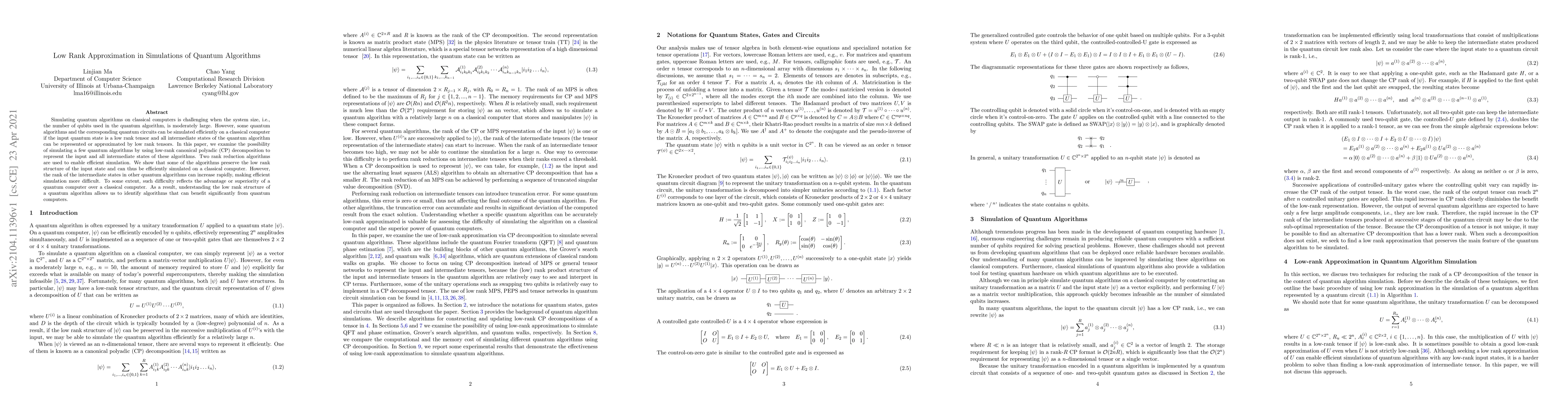 This paper explores the use of low-rank tensor approximations via canonical polyadic decomposition to efficiently simulate certain quantum algorithms on classical computers. It finds that while some quantum algorithms maintain low-rank structures, others experience rapid rank increase, highlighting the quantum advantage and the potential for identifying algorithms that benefit from quantum computing.