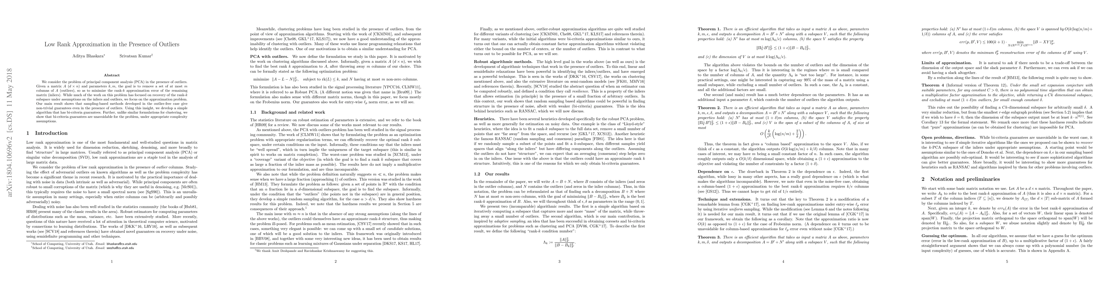 This paper addresses the challenge of performing principal component analysis (PCA) when a matrix contains outliers, proposing a method to identify and remove at most $m$ outlier columns to minimize rank-$k$ approximation error. It demonstrates that existing sampling-based methods retain effectiveness in the presence of outliers, leading to a new algorithm with bi-criteria guarantees, proving that such guarantees are necessary under certain complexity assumptions.