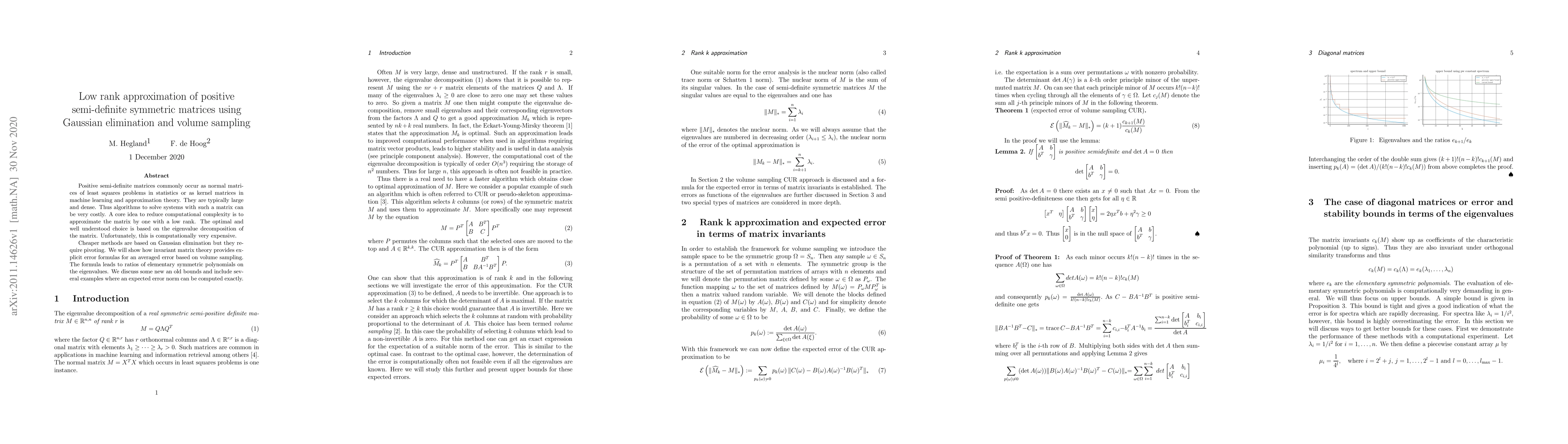 Researchers developed a method to approximate positive semi-definite matrices with low rank using Gaussian elimination and volume sampling, reducing computational complexity for least squares problems in statistics and machine learning.
