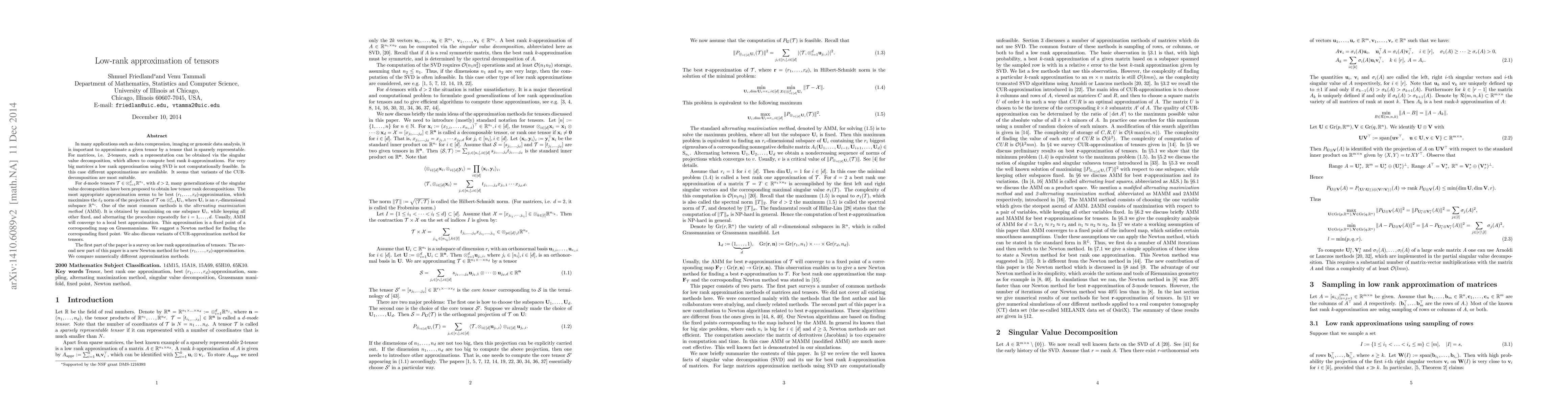 In many applications such as data compression, imaging or genomic data analysis, it is important to approximate a given tensor by a tensor that is sparsely representable. For matrices, i.e. 2-tensors, such a representation can be obtained via the singular value decomposition, which allows to compute best rank k-approximations. For very big matrices a low rank approximation using SVD is not computationally feasible. In this case different approximations are available. It seems that variants of CUR decomposition are most suitable. For d-mode tensors T with d>2, many generalizations of the singular value decomposition have been proposed to obtain low tensor rank decompositions. The most appropriate approximation seems to be best (r_1,...,r_d)-approximation, which maximizes the l_2 norm of the projection of T on a tensor product of subspaces U_1,...,U_d, where U_i is an r_i-dimensional subspace. One of the most common method is the alternating maximization method (AMM). It is obtained by maximizing on one subspace U_i, while keeping all other fixed, and alternating the procedure repeatedly for i=1,...,d. Usually, AMM will converge to a local best approximation. This approximation is a fixed point of a corresponding map on Grassmannians. We suggest a Newton method for finding the corresponding fixed point. We also discuss variants of CUR-approximation method for tensors. The first part of the paper is a survey on low rank approximation of tensors. The second new part of this paper is a new Newton method for best $(r_1,...,r_d)$-approximation. We compare numerically different approximation methods.
