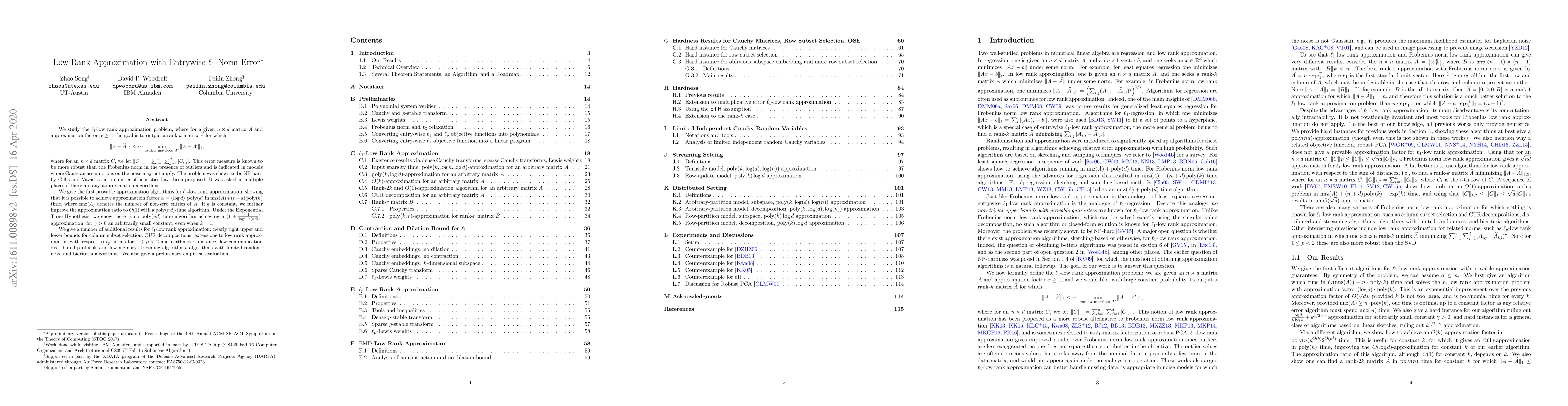 This paper presents the first provable approximation algorithms for the $\ell_1$-low rank approximation problem, achieving an approximation factor of $(\log d) \cdot \mathrm{poly}(k)$ in polynomial time. It also establishes the computational hardness under the Exponential Time Hypothesis and provides additional results including bounds, distributed protocols, and empirical evaluation.