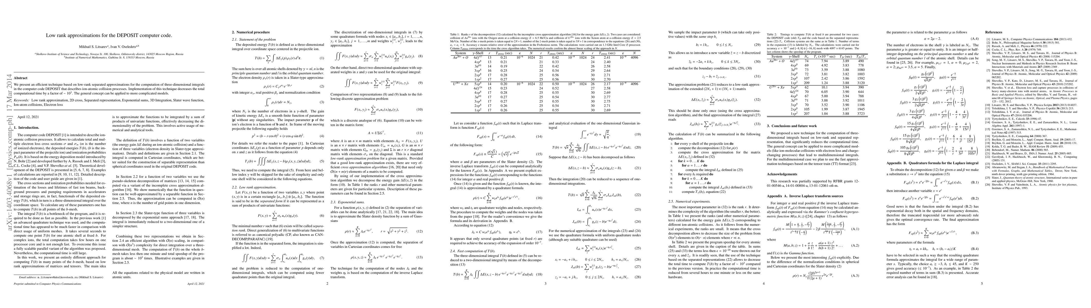 We present an efficient technique based on low-rank separated approximations for the computation of three-dimensional integrals in the computer code DEPOSIT that describes ion-atomic collision processes. Implementation of this technique decreases the total computational time by a factor of 1000. The general concept can be applied to more complicated models.