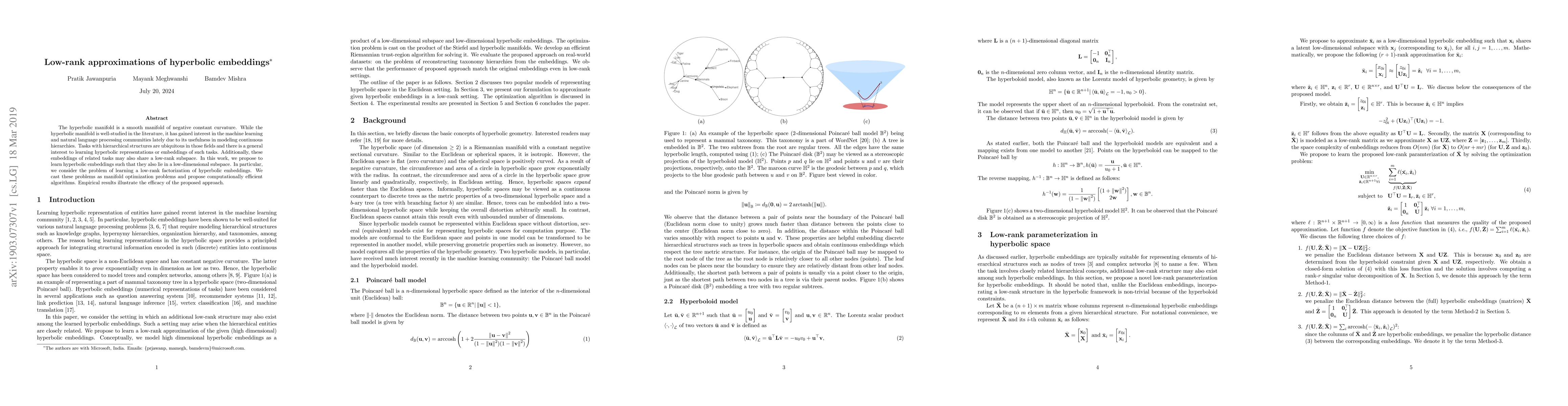 This paper proposes a method to learn low-rank approximations of hyperbolic embeddings, which are useful for modeling hierarchical structures in machine learning and natural language processing. The authors develop efficient algorithms for manifold optimization and demonstrate the effectiveness of their approach through empirical results.