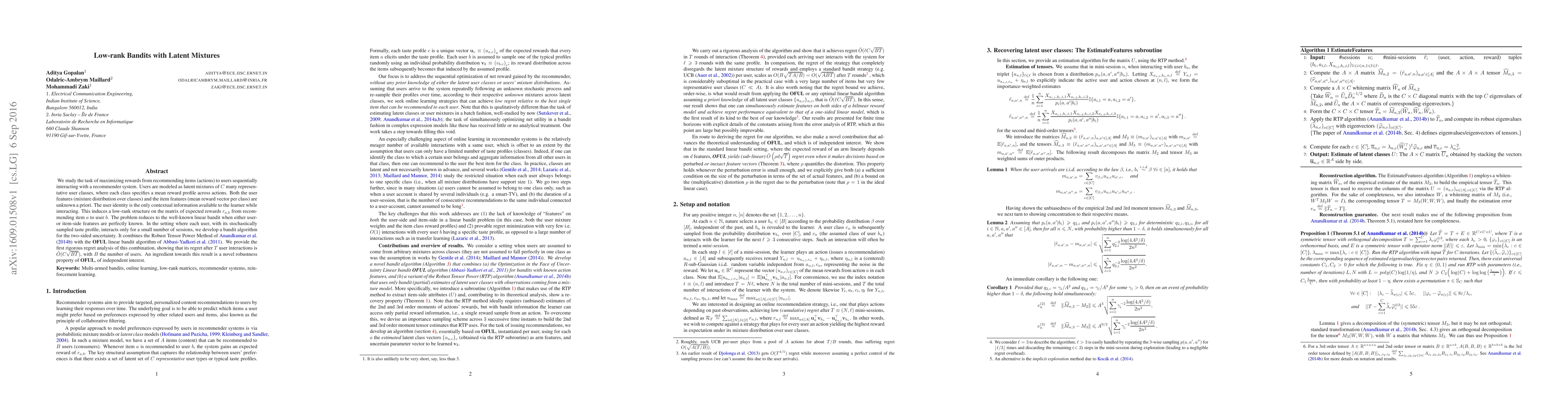 We study the task of maximizing rewards from recommending items (actions) to users sequentially interacting with a recommender system. Users are modeled as latent mixtures of C many representative user classes, where each class specifies a mean reward profile across actions. Both the user features (mixture distribution over classes) and the item features (mean reward vector per class) are unknown a priori. The user identity is the only contextual information available to the learner while interacting. This induces a low-rank structure on the matrix of expected rewards r a,b from recommending item a to user b. The problem reduces to the well-known linear bandit when either user or item-side features are perfectly known. In the setting where each user, with its stochastically sampled taste profile, interacts only for a small number of sessions, we develop a bandit algorithm for the two-sided uncertainty. It combines the Robust Tensor Power Method of Anandkumar et al. (2014b) with the OFUL linear bandit algorithm of Abbasi-Yadkori et al. (2011). We provide the first rigorous regret analysis of this combination, showing that its regret after T user interactions is $\tilde O(C\sqrt{BT})$, with B the number of users. An ingredient towards this result is a novel robustness property of OFUL, of independent interest.