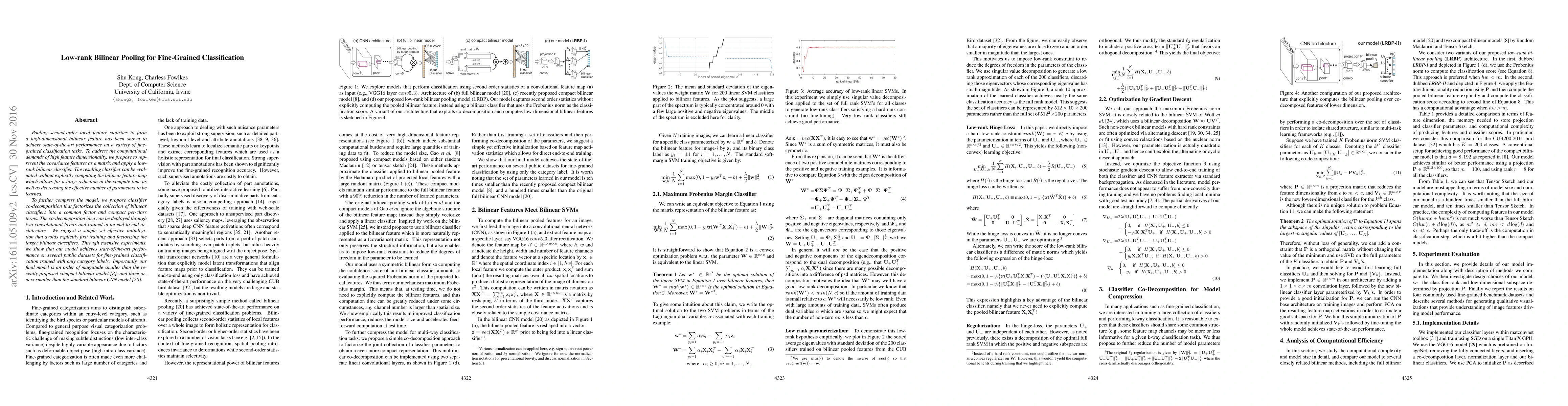 This paper proposes a low-rank bilinear pooling method for fine-grained classification that significantly reduces computational demands by factorizing the bilinear feature map into a low-rank matrix and using classifier co-decomposition. This approach achieves state-of-the-art performance while being substantially smaller than existing models.