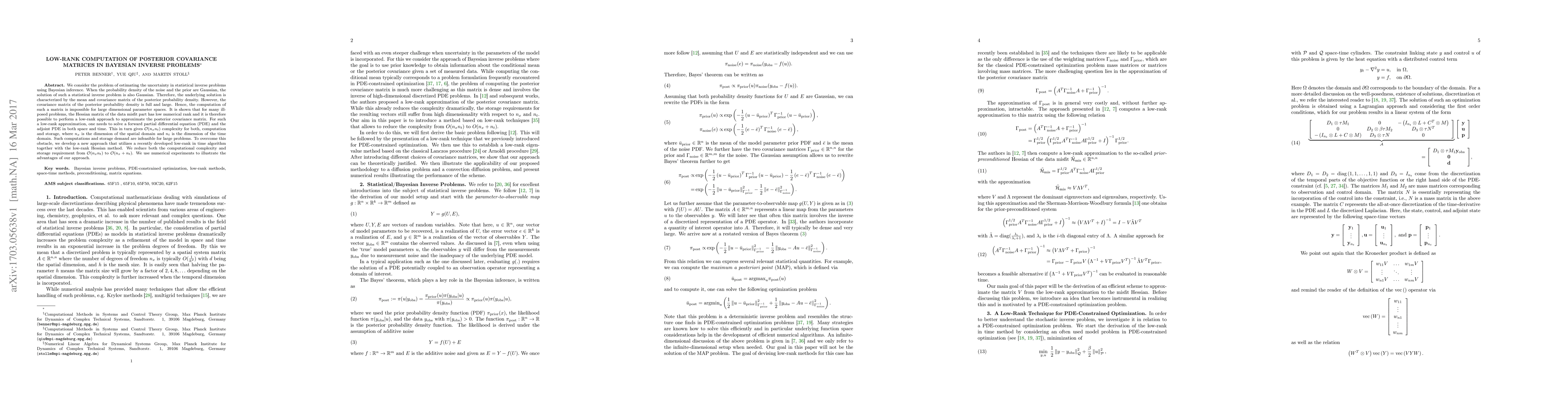 This paper proposes a low-rank computational method to estimate the posterior covariance matrix in Bayesian inverse problems, addressing the infeasibility of direct computation in large dimensional parameter spaces. The method leverages the low numerical rank of the Hessian matrix to reduce computational complexity and storage from $\mathcal{O}(n_x n_t)$ to $\mathcal{O}(n_x + n_t)$, demonstrated through numerical experiments.