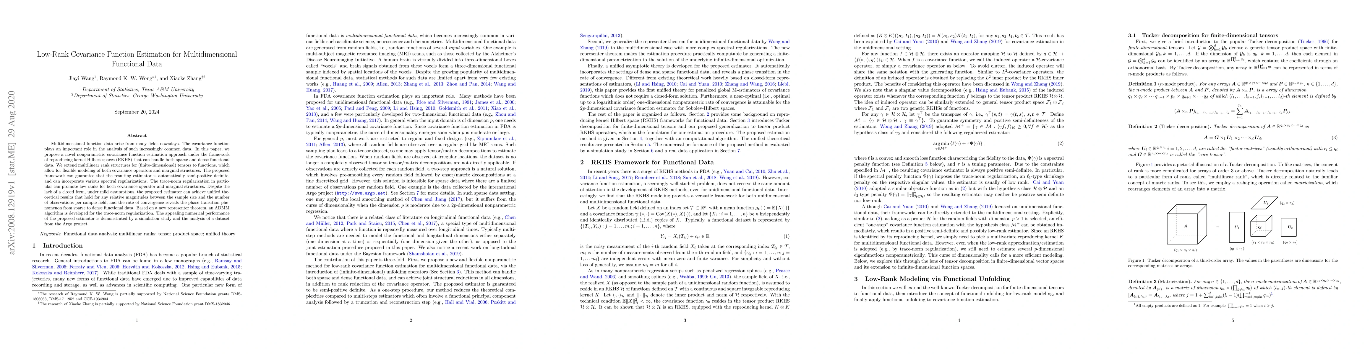 This paper proposes a novel nonparametric approach for estimating covariance functions in multidimensional functional data using reproducing kernel Hilbert spaces. It introduces a framework that extends multilinear rank structures to functions, ensuring semi-positive definiteness and promoting low ranks through trace-norm regularization, with an ADMM algorithm for efficient computation.
