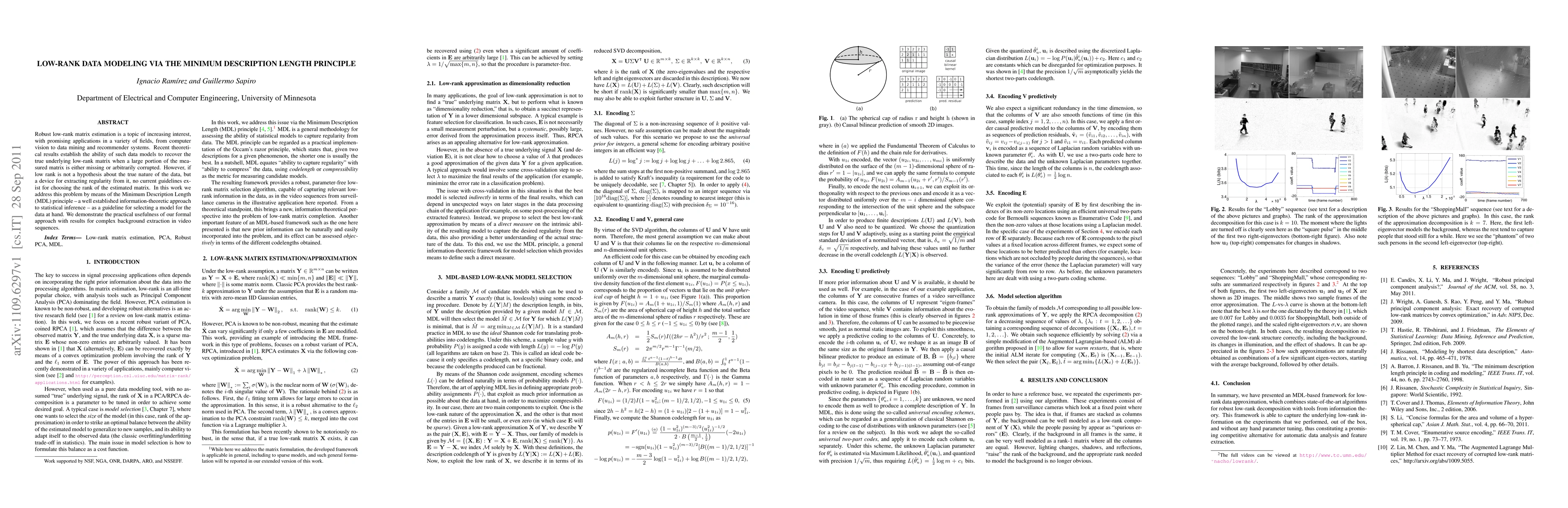 Robust low-rank matrix estimation is a topic of increasing interest, with promising applications in a variety of fields, from computer vision to data mining and recommender systems. Recent theoretical results establish the ability of such data models to recover the true underlying low-rank matrix when a large portion of the measured matrix is either missing or arbitrarily corrupted. However, if low rank is not a hypothesis about the true nature of the data, but a device for extracting regularity from it, no current guidelines exist for choosing the rank of the estimated matrix. In this work we address this problem by means of the Minimum Description Length (MDL) principle -- a well established information-theoretic approach to statistical inference -- as a guideline for selecting a model for the data at hand. We demonstrate the practical usefulness of our formal approach with results for complex background extraction in video sequences.