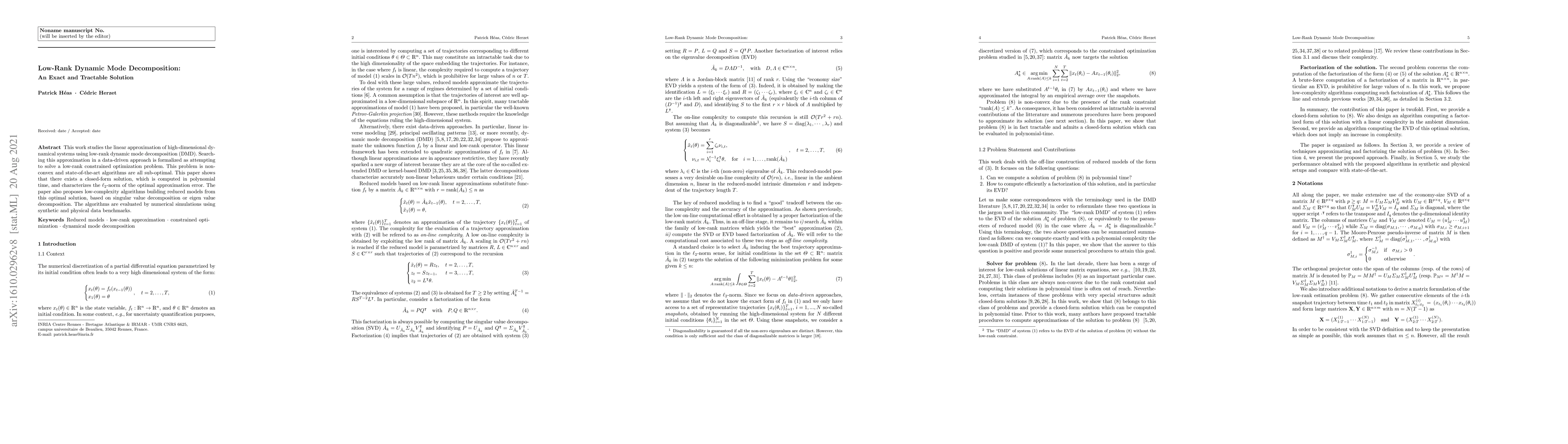 This paper presents a low-rank dynamic mode decomposition (DMD) method that provides an exact closed-form solution for approximating high-dimensional dynamical systems, contrasting with sub-optimal state-of-the-art algorithms. It also introduces efficient algorithms based on singular value or eigenvalue decomposition for constructing reduced models, validated through numerical simulations.