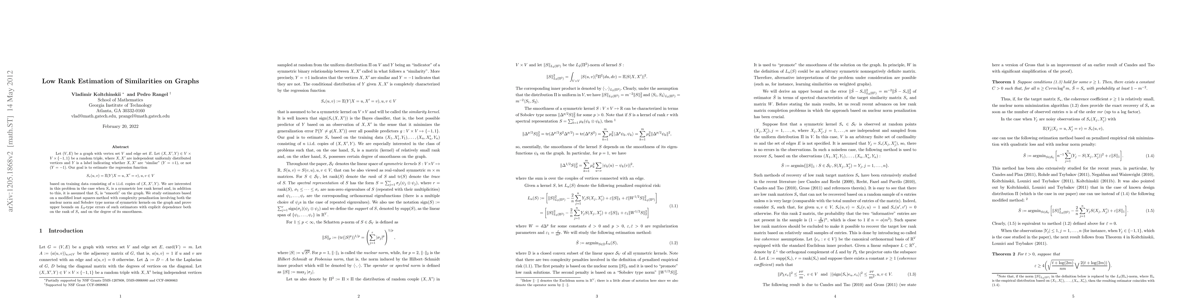 Let (V, E) be a graph with vertex set V and edge set E. Let (X, X', Y) \in V \times V \times {-1, 1} be a random triple, where X, X' are independent uniformly distributed vertices and Y is a label indicating whether X, X' are "similar" (Y = +1), or not (Y = -1). Our goal is to estimate the regression function S\ast (u, v) = E(Y |X = u, X = v), u, v \in V based on training data consisting of n i.i.d. copies of (X, X',Y). We are interested in this problem in the case when S\ast is a symmetric low rank kernel and, in addition to this, it is assumed that S\ast is "smooth" on the graph. We study estimators based on a modified least squares method with complexity penalization involving both the nuclear norm and Sobolev type norms of symmetric kernels on the graph and prove upper bounds on L2 -type errors of such estimators with explicit dependence both on the rank of S\ast and on the degree of its smoothness.