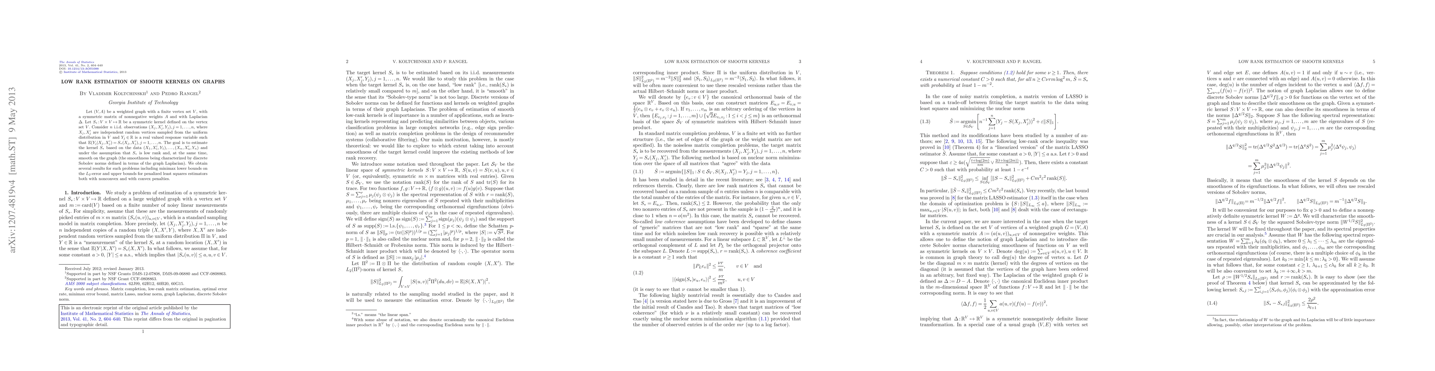 Let (V,A) be a weighted graph with a finite vertex set V, with a symmetric matrix of nonnegative weights A and with Laplacian $\Delta$. Let $S_*:V\times V\mapsto{\mathbb{R}}$ be a symmetric kernel defined on the vertex set V. Consider n i.i.d. observations $(X_j,X_j',Y_j),j=1,\ldots,n$, where $X_j,X_j'$ are independent random vertices sampled from the uniform distribution in V and $Y_j\in{\mathbb{R}}$ is a real valued response variable such that ${\mathbb{E}}(Y_j|X_j,X_j')=S_*(X_j,X_j'),j=1,\ldots,n$. The goal is to estimate the kernel $S_*$ based on the data $(X_1,X_1',Y_1),\ldots,(X_n,X_n',Y_n)$ and under the assumption that $S_*$ is low rank and, at the same time, smooth on the graph (the smoothness being characterized by discrete Sobolev norms defined in terms of the graph Laplacian). We obtain several results for such problems including minimax lower bounds on the $L_2$-error and upper bounds for penalized least squares estimators both with nonconvex and with convex penalties.