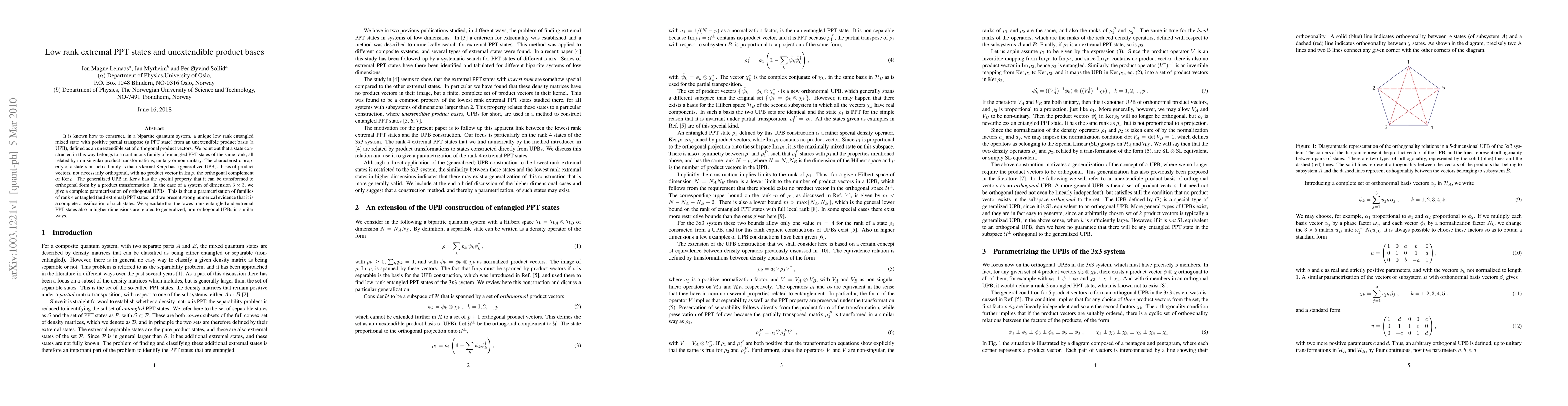 It is known how to construct, in a bipartite quantum system, a unique low rank entangled mixed state with positive partial transpose (a PPT state) from an unextendible product basis (a UPB), defined as an unextendible set of orthogonal product vectors. We point out that a state constructed in this way belongs to a continuous family of entangled PPT states of the same rank, all related by non-singular product transformations, unitary or non-unitary. The characteristic property of a state $\rho$ in such a family is that its kernel $\Ker\rho$ has a generalized UPB, a basis of product vectors, not necessarily orthogonal, with no product vector in $\Im\rho$, the orthogonal complement of $\Ker\rho$. The generalized UPB in $\Ker\rho$ has the special property that it can be transformed to orthogonal form by a product transformation. In the case of a system of dimension $3\times 3$, we give a complete parametrization of orthogonal UPBs. This is then a parametrization of families of rank 4 entangled (and extremal) PPT states, and we present strong numerical evidence that it is a complete classification of such states. We speculate that the lowest rank entangled and extremal PPT states also in higher dimensions are related to generalized, non-orthogonal UPBs in similar ways.