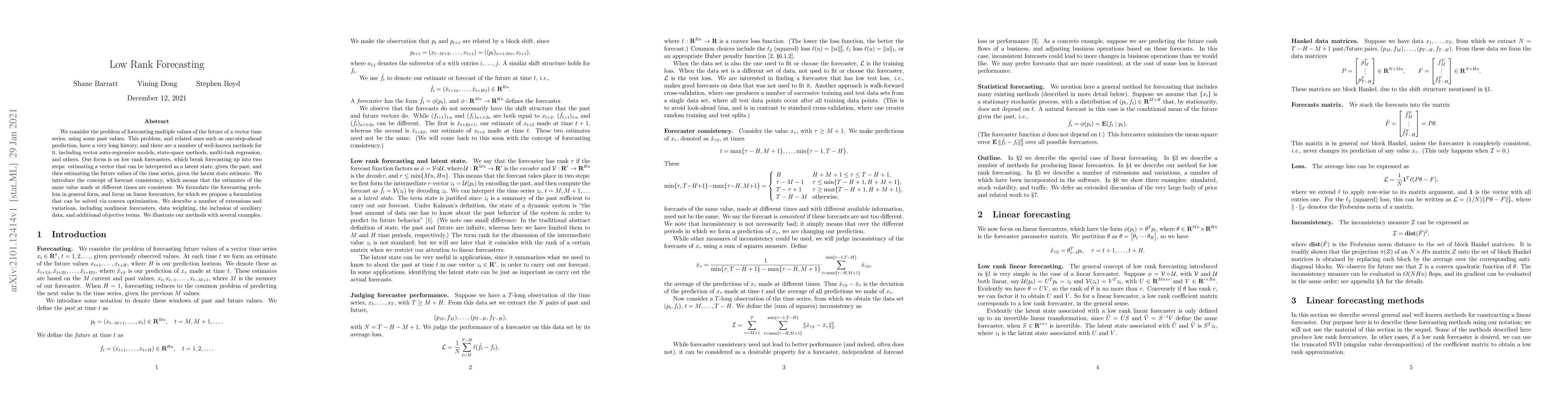 We consider the problem of forecasting multiple values of the future of a vector time series, using some past values. This problem, and related ones such as one-step-ahead prediction, have a very long history, and there are a number of well-known methods for it, including vector auto-regressive models, state-space methods, multi-task regression, and others. Our focus is on low rank forecasters, which break forecasting up into two steps: estimating a vector that can be interpreted as a latent state, given the past, and then estimating the future values of the time series, given the latent state estimate. We introduce the concept of forecast consistency, which means that the estimates of the same value made at different times are consistent. We formulate the forecasting problem in general form, and focus on linear forecasters, for which we propose a formulation that can be solved via convex optimization. We describe a number of extensions and variations, including nonlinear forecasters, data weighting, the inclusion of auxiliary data, and additional objective terms. We illustrate our methods with several examples.