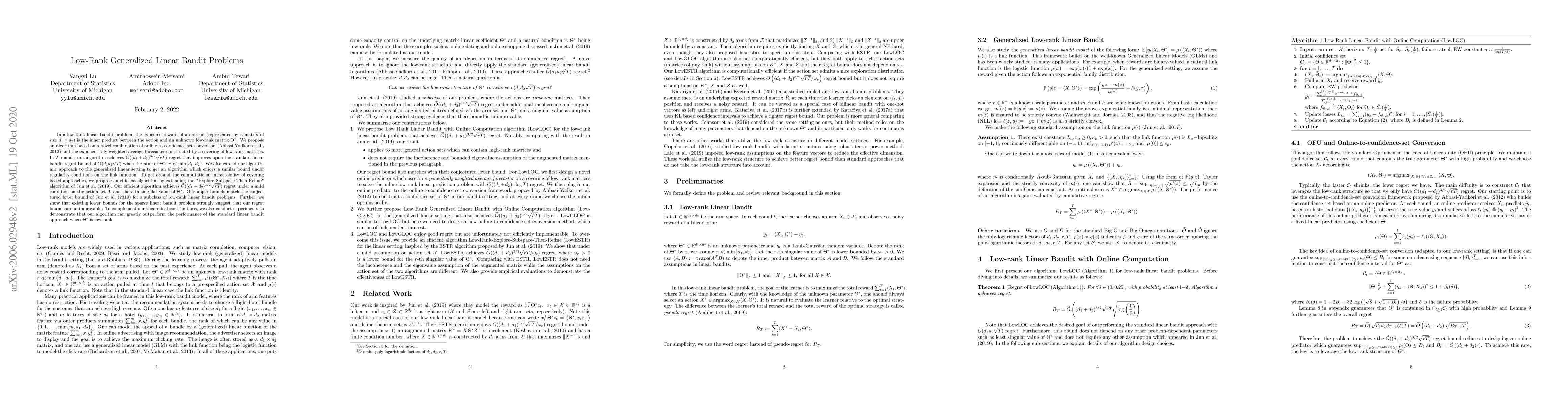 This paper proposes an improved algorithm for low-rank linear bandit problems, achieving better regret bounds when the unknown matrix has a small rank compared to its dimensions. The algorithm combines online-to-confidence-set conversion and an exponentially weighted average forecaster, and it extends to generalized linear settings under certain conditions. Experimental results show significant performance gains over standard linear bandit approaches when the reward matrix is low-rank.