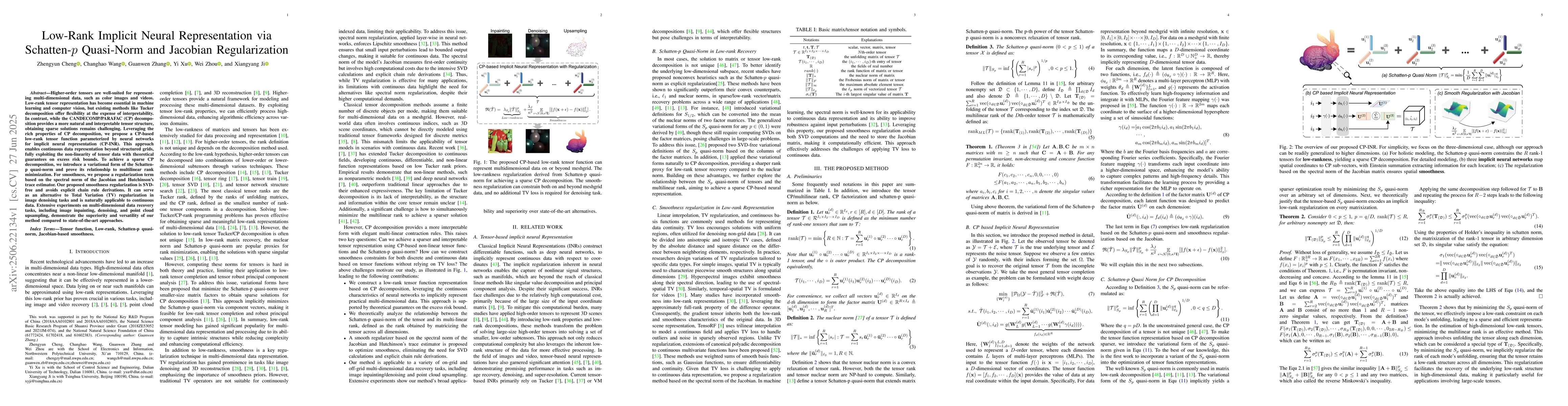 Higher-order tensors are well-suited for representing multi-dimensional data, such as color images and videos. Low-rank tensor representation has become essential in machine learning and computer vision, but existing methods like Tucker decomposition offer flexibility at the expense of interpretability. In contrast, while the CANDECOMP/PARAFAC (CP) decomposition provides a more natural and interpretable tensor structure, obtaining sparse solutions remains challenging. Leveraging the rich properties of CP decomposition, we propose a CP-based low-rank tensor function parameterized by neural networks for implicit neural representation (CP-INR). This approach enables continuous data representation beyond structured grids, fully exploiting the non-linearity of tensor data with theoretical guarantees on excess risk bounds. To achieve a sparse CP decomposition, we introduce a variational form of the Schatten-p quasi-norm and prove its relationship to multilinear rank minimization. For smoothness, we propose a regularization term based on the spectral norm of the Jacobian and Hutchinson's trace estimator. Our proposed smoothness regularization is SVD-free and avoids explicit chain rule derivations. It can serve as an alternative to Total Variation (TV) regularization in image denoising tasks and is naturally applicable to continuous data. Extensive experiments on multi-dimensional data recovery tasks, including image inpainting, denoising, and point cloud upsampling, demonstrate the superiority and versatility of our method compared to state-of-the-art approaches.