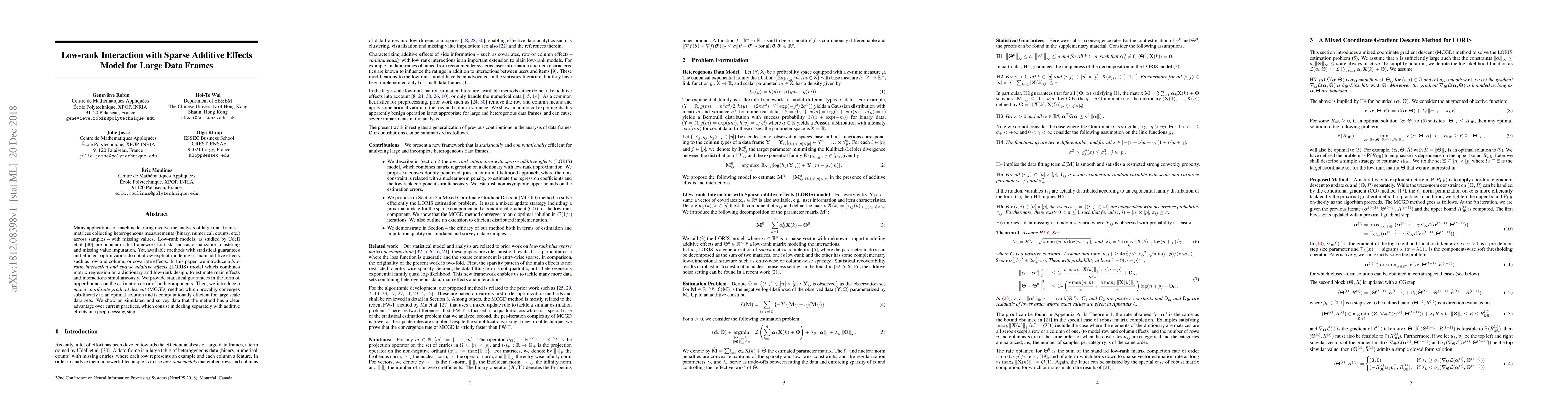 This paper proposes a LORIS model that combines low-rank interaction and sparse additive effects to simultaneously estimate main effects and interactions in large data matrices. It introduces a mixed coordinate gradient descent method that converges sub-linearly and is efficient for large-scale datasets, demonstrating advantages over current separate preprocessing methods.
