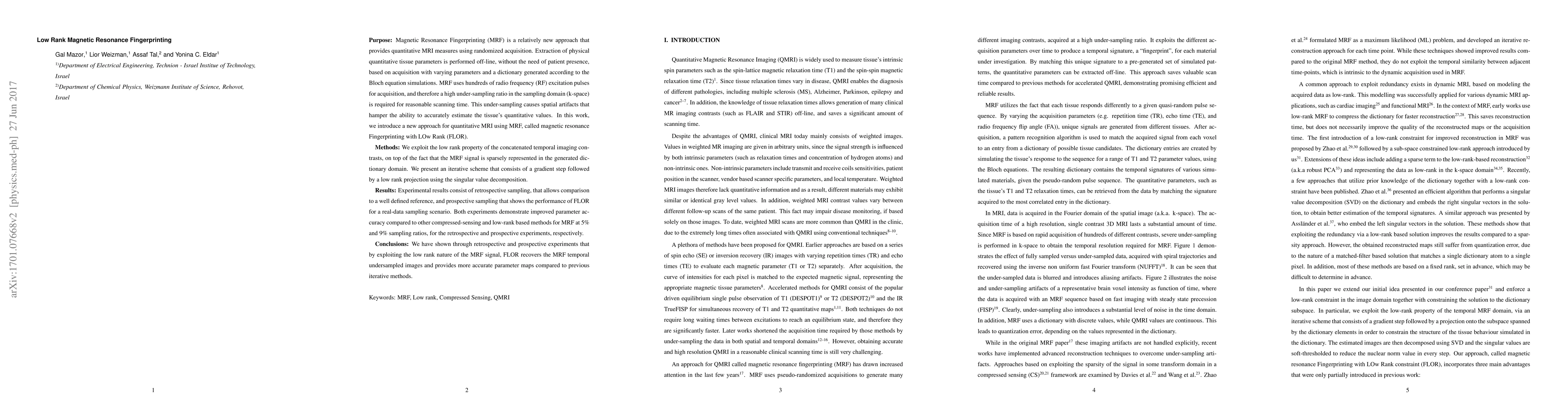 This paper introduces a novel low rank approach, FLOR, for Magnetic Resonance Fingerprinting (MRF) to improve quantitative MRI measures. By leveraging the low rank property of MRF signals and sparse representation, FLOR enhances parameter accuracy over compressed-sensing and low-rank methods, as demonstrated in both retrospective and prospective experiments.