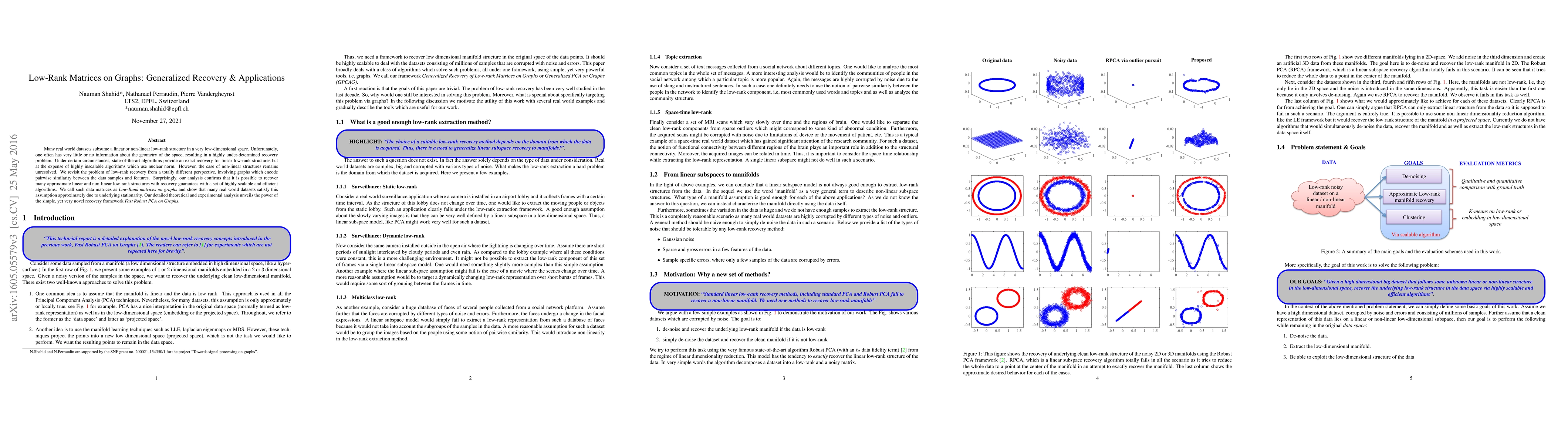 Many real world datasets subsume a linear or non-linear low-rank structure in a very low-dimensional space. Unfortunately, one often has very little or no information about the geometry of the space, resulting in a highly under-determined recovery problem. Under certain circumstances, state-of-the-art algorithms provide an exact recovery for linear low-rank structures but at the expense of highly inscalable algorithms which use nuclear norm. However, the case of non-linear structures remains unresolved. We revisit the problem of low-rank recovery from a totally different perspective, involving graphs which encode pairwise similarity between the data samples and features. Surprisingly, our analysis confirms that it is possible to recover many approximate linear and non-linear low-rank structures with recovery guarantees with a set of highly scalable and efficient algorithms. We call such data matrices as \textit{Low-Rank matrices on graphs} and show that many real world datasets satisfy this assumption approximately due to underlying stationarity. Our detailed theoretical and experimental analysis unveils the power of the simple, yet very novel recovery framework \textit{Fast Robust PCA on Graphs}