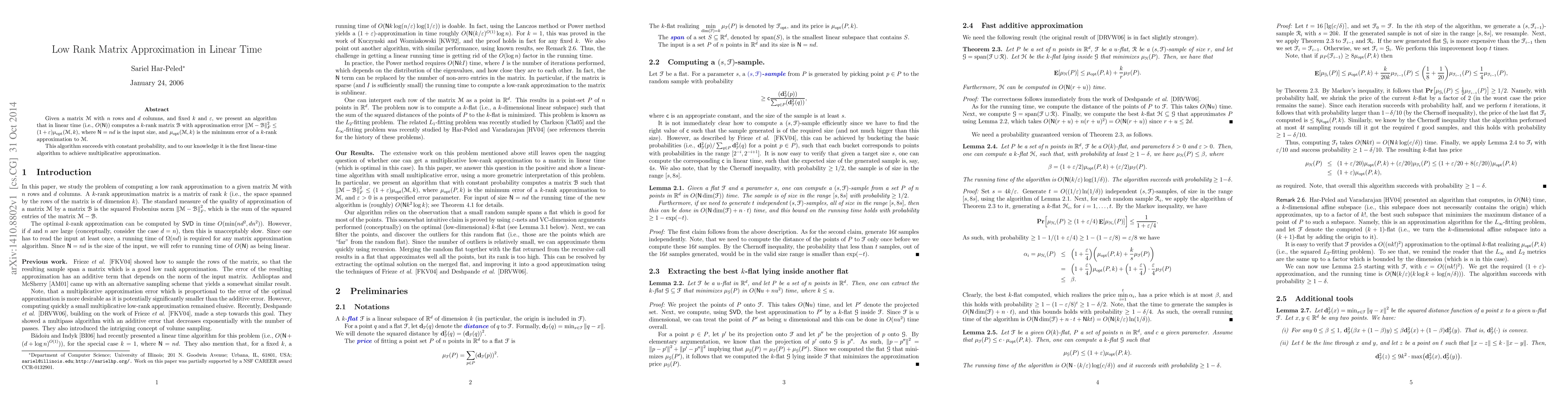 $\newcommand{\MatA}{\mathcal{M}}$ $\newcommand{\eps}{\varepsilon}$ $\newcommand{\NSize}{\mathsf{N}{}}$ $\newcommand{\MatB}{\mathcal{B}}$ $\newcommand{\Fnorm}[1]{\left\| {#1} \right\|_F}$ $\newcommand{\PrcOpt}[2]{\mu_{\mathrm{opt}}\pth{#1, #2}}$ $\newcommand{\pth}[1]{\left(#1\right)}$ Given a matrix $\MatA$ with $n$ rows and $d$ columns, and fixed $k$ and $\eps$, we present an algorithm that in linear time (i.e., $O(\NSize )$) computes a $k$-rank matrix $\MatB$ with approximation error $\Fnorm{\MatA - \MatB}^2 \leq (1+\eps) \PrcOpt{\MatA}{k}$, where $\NSize = n d$ is the input size, and $\PrcOpt{\MatA}{k}$ is the minimum error of a $k$-rank approximation to $\MatA$. This algorithm succeeds with constant probability, and to our knowledge it is the first linear-time algorithm to achieve multiplicative approximation.