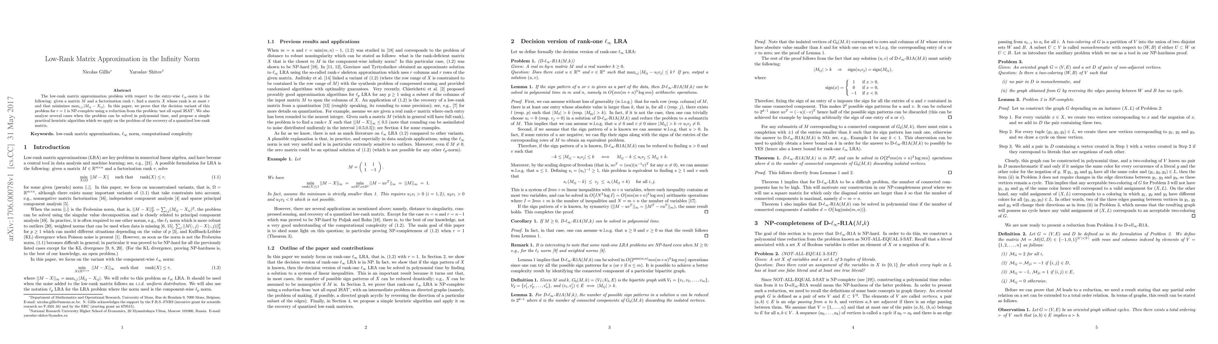 The low-rank matrix approximation problem with respect to the entry-wise $\ell_{\infty}$-norm is the following: given a matrix $M$ and a factorization rank $r$, find a matrix $X$ whose rank is at most $r$ and that minimizes $\max_{i,j} |M_{ij} - X_{ij}|$. In this paper, we prove that the decision variant of this problem for $r=1$ is NP-complete using a reduction from the problem `not all equal 3SAT'. We also analyze several cases when the problem can be solved in polynomial time, and propose a simple practical heuristic algorithm which we apply on the problem of the recovery of a quantized low-rank matrix.