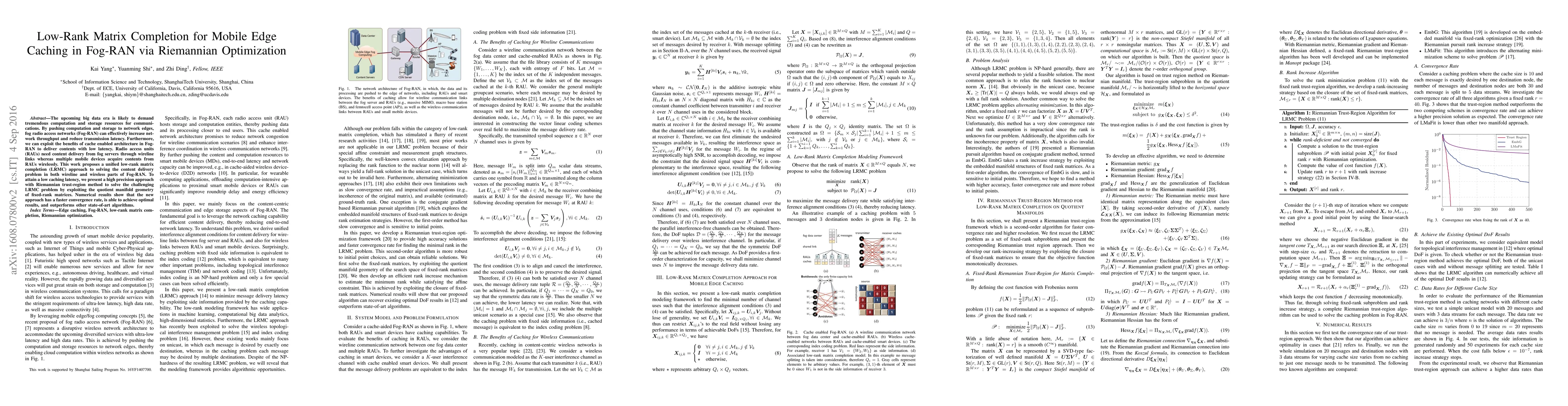 This paper proposes a low-rank matrix completion approach for mobile edge caching in Fog-RAN, utilizing Riemannian optimization to enhance content delivery efficiency. The method achieves faster convergence and optimal results compared to existing algorithms, effectively reducing transmission latency and improving network throughput.