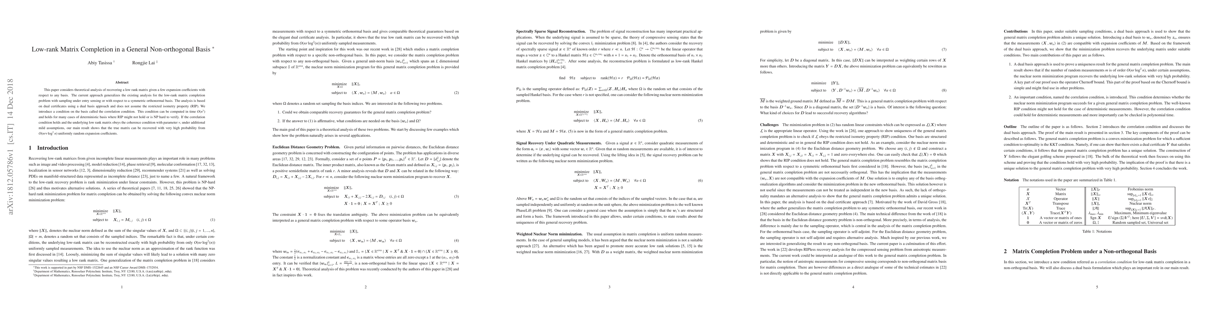 This paper generalizes low-rank matrix completion theory to non-orthogonal bases, introducing a correlation condition that can replace the restricted isometry property. It demonstrates that with $O(nr\nu\log^2n)$ random expansion coefficients, the true low-rank matrix can be recovered with high probability.