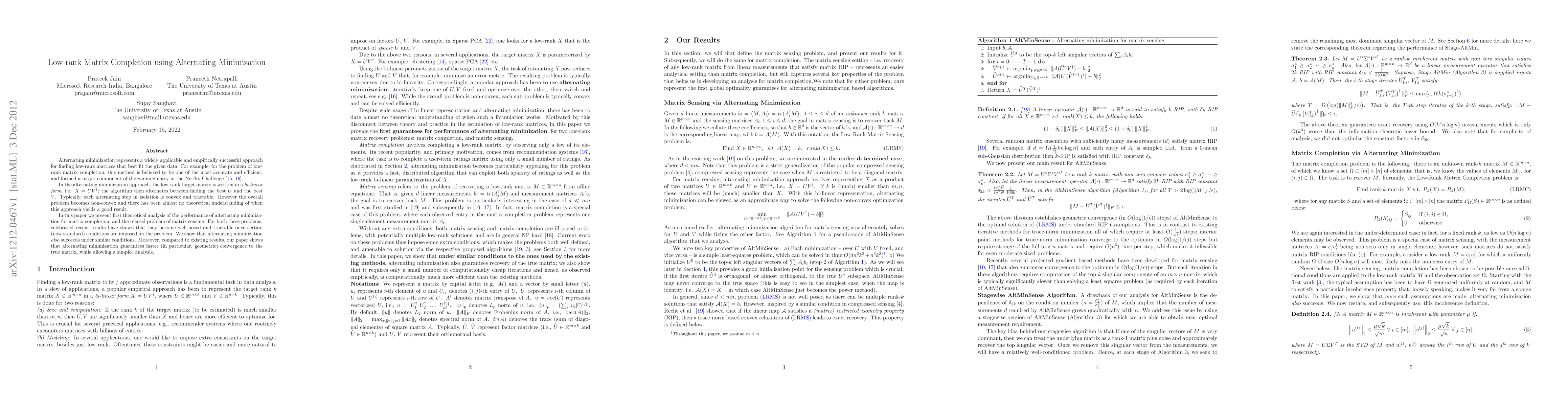 Alternating minimization represents a widely applicable and empirically successful approach for finding low-rank matrices that best fit the given data. For example, for the problem of low-rank matrix completion, this method is believed to be one of the most accurate and efficient, and formed a major component of the winning entry in the Netflix Challenge. In the alternating minimization approach, the low-rank target matrix is written in a bi-linear form, i.e. $X = UV^\dag$; the algorithm then alternates between finding the best $U$ and the best $V$. Typically, each alternating step in isolation is convex and tractable. However the overall problem becomes non-convex and there has been almost no theoretical understanding of when this approach yields a good result. In this paper we present first theoretical analysis of the performance of alternating minimization for matrix completion, and the related problem of matrix sensing. For both these problems, celebrated recent results have shown that they become well-posed and tractable once certain (now standard) conditions are imposed on the problem. We show that alternating minimization also succeeds under similar conditions. Moreover, compared to existing results, our paper shows that alternating minimization guarantees faster (in particular, geometric) convergence to the true matrix, while allowing a simpler analysis.