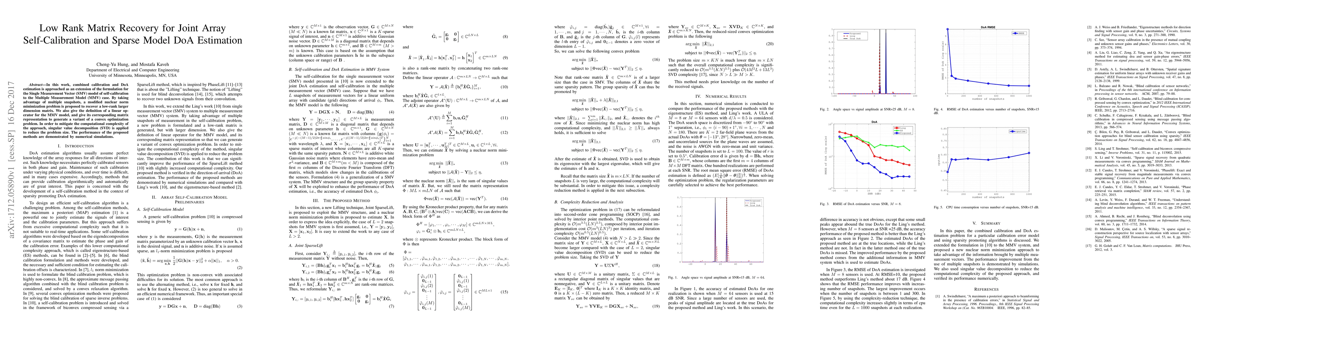 This paper proposes a low-rank matrix recovery method for joint array self-calibration and sparse Direction of Arrival (DoA) estimation using the Multiple Measurement Vector (MMV) model. It employs a modified nuclear norm minimization and singular value decomposition to address computational complexity, validated through numerical simulations.