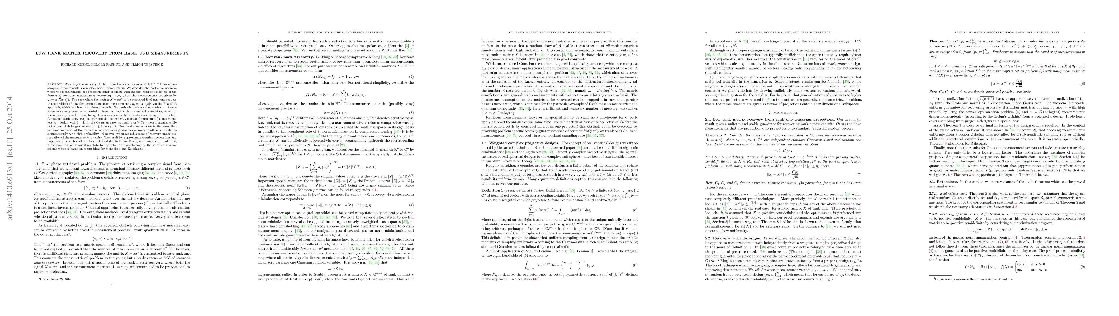 We study the recovery of Hermitian low rank matrices $X \in \mathbb{C}^{n \times n}$ from undersampled measurements via nuclear norm minimization. We consider the particular scenario where the measurements are Frobenius inner products with random rank-one matrices of the form $a_j a_j^*$ for some measurement vectors $a_1,...,a_m$, i.e., the measurements are given by $y_j = \mathrm{tr}(X a_j a_j^*)$. The case where the matrix $X=x x^*$ to be recovered is of rank one reduces to the problem of phaseless estimation (from measurements, $y_j = |\langle x,a_j\rangle|^2$ via the PhaseLift approach, which has been introduced recently. We derive bounds for the number $m$ of measurements that guarantee successful uniform recovery of Hermitian rank $r$ matrices, either for the vectors $a_j$, $j=1,...,m$, being chosen independently at random according to a standard Gaussian distribution, or $a_j$ being sampled independently from an (approximate) complex projective $t$-design with $t=4$. In the Gaussian case, we require $m \geq C r n$ measurements, while in the case of $4$-designs we need $m \geq Cr n \log(n)$. Our results are uniform in the sense that one random choice of the measurement vectors $a_j$ guarantees recovery of all rank $r$-matrices simultaneously with high probability. Moreover, we prove robustness of recovery under perturbation of the measurements by noise. The result for approximate $4$-designs generalizes and improves a recent bound on phase retrieval due to Gross, Kueng and Krahmer. In addition, it has applications in quantum state tomography. Our proofs employ the so-called bowling scheme which is based on recent ideas by Mendelson and Koltchinskii.
