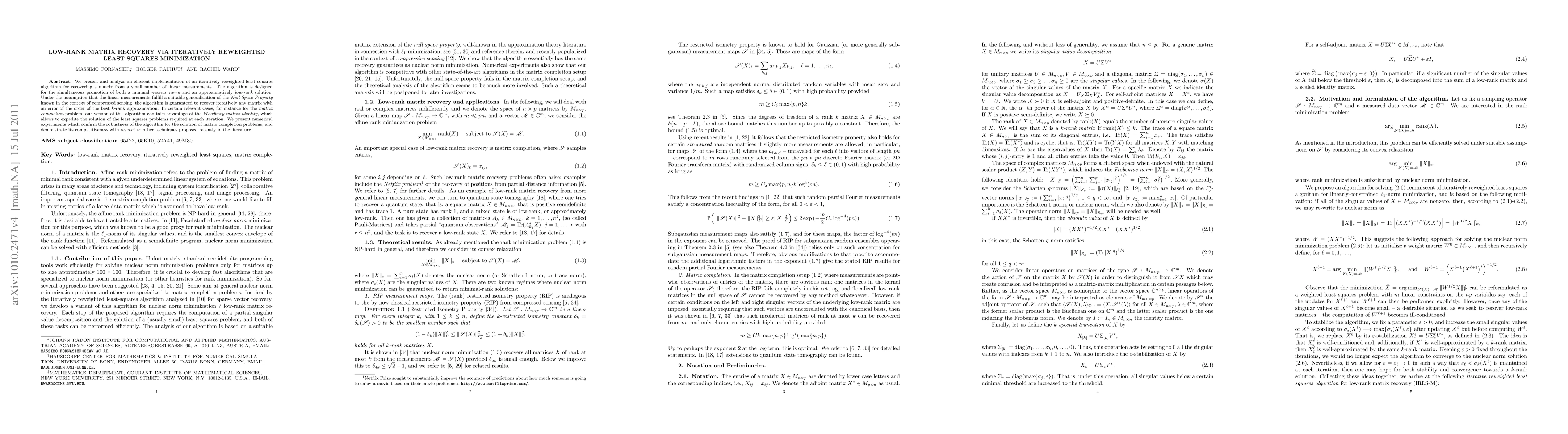 This paper presents an iteratively reweighted least squares algorithm for low-rank matrix recovery, ensuring minimal nuclear norm and approximate low-rank solutions. The algorithm leverages the Woodbury matrix identity for efficiency in matrix completion problems, and numerical experiments confirm its robustness and competitiveness against other recent techniques.