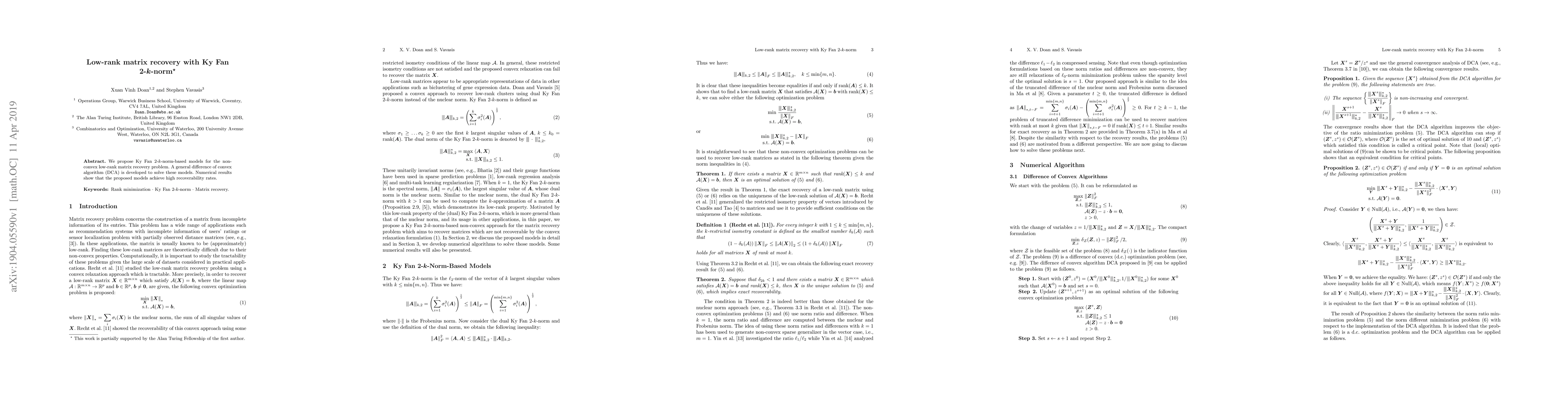 This paper proposes Ky Fan 2-k-norm-based models for nonconvex low-rank matrix recovery and develops a difference of convex algorithm to solve them. Numerical results demonstrate that the proposed models achieve high recovery accuracy.