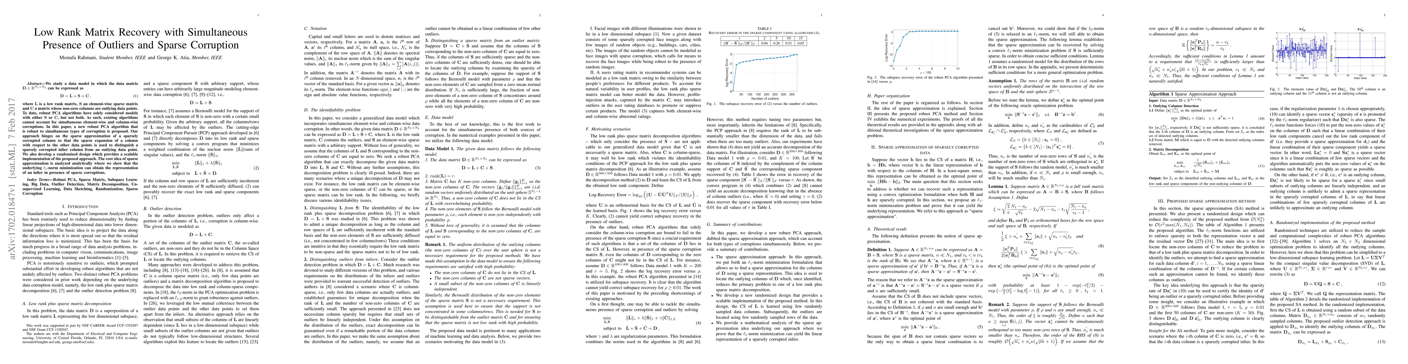 We study a data model in which the data matrix D can be expressed as D = L + S + C, where L is a low rank matrix, S an element-wise sparse matrix and C a matrix whose non-zero columns are outlying data points. To date, robust PCA algorithms have solely considered models with either S or C, but not both. As such, existing algorithms cannot account for simultaneous element-wise and column-wise corruptions. In this paper, a new robust PCA algorithm that is robust to simultaneous types of corruption is proposed. Our approach hinges on the sparse approximation of a sparsely corrupted column so that the sparse expansion of a column with respect to the other data points is used to distinguish a sparsely corrupted inlier column from an outlying data point. We also develop a randomized design which provides a scalable implementation of the proposed approach. The core idea of sparse approximation is analyzed analytically where we show that the underlying ell_1-norm minimization can obtain the representation of an inlier in presence of sparse corruptions.