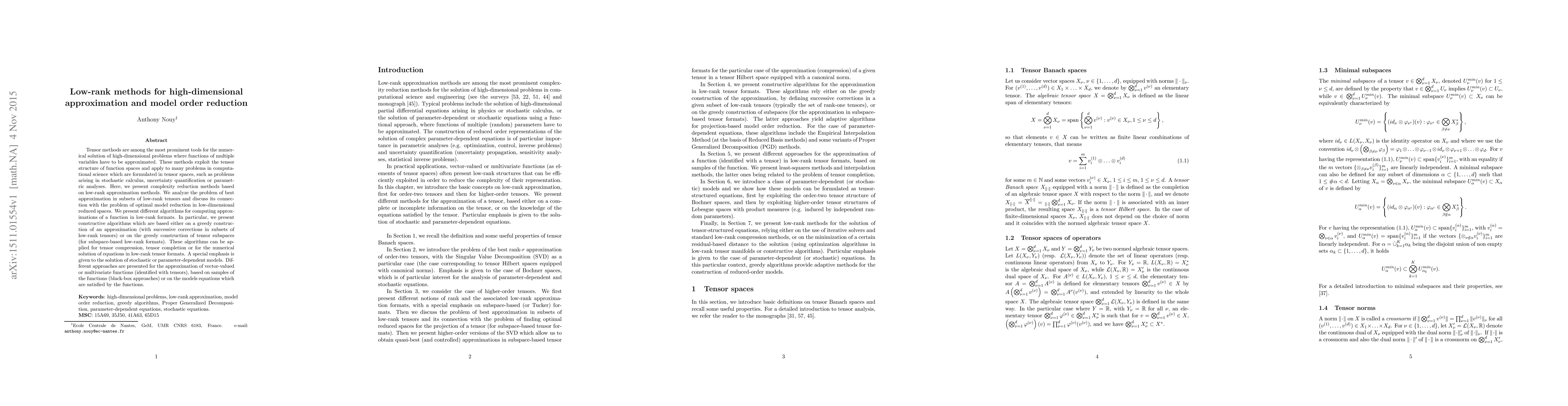 This paper explores low-rank tensor methods for high-dimensional approximation and model reduction, presenting algorithms for tensor compression and completion. It focuses on the best approximation in low-rank tensors and optimal model reduction, with applications to stochastic and parameter-dependent models.