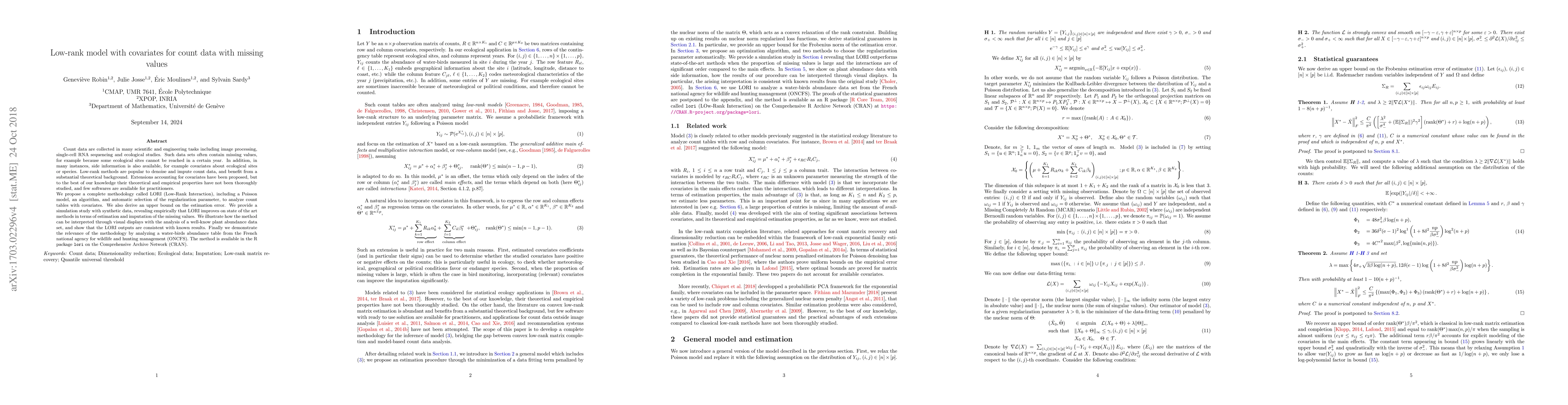 Count data are collected in many scientific and engineering tasks including image processing, single-cell RNA sequencing and ecological studies. Such data sets often contain missing values, for example because some ecological sites cannot be reached in a certain year. In addition, in many instances, side information is also available, for example covariates about ecological sites or species. Low-rank methods are popular to denoise and impute count data, and benefit from a substantial theoretical background. Extensions accounting for covariates have been proposed, but to the best of our knowledge their theoretical and empirical properties have not been thoroughly studied, and few softwares are available for practitioners. We propose a complete methodology called LORI (Low-Rank Interaction), including a Poisson model, an algorithm, and automatic selection of the regularization parameter, to analyze count tables with covariates. We also derive an upper bound on the estimation error. We provide a simulation study with synthetic data, revealing empirically that LORI improves on state of the art methods in terms of estimation and imputation of the missing values. We illustrate how the method can be interpreted through visual displays with the analysis of a well-know plant abundance data set, and show that the LORI outputs are consistent with known results. Finally we demonstrate the relevance of the methodology by analyzing a water-birds abundance table from the French national agency for wildlife and hunting management (ONCFS). The method is available in the R package lori on the Comprehensive Archive Network (CRAN).
