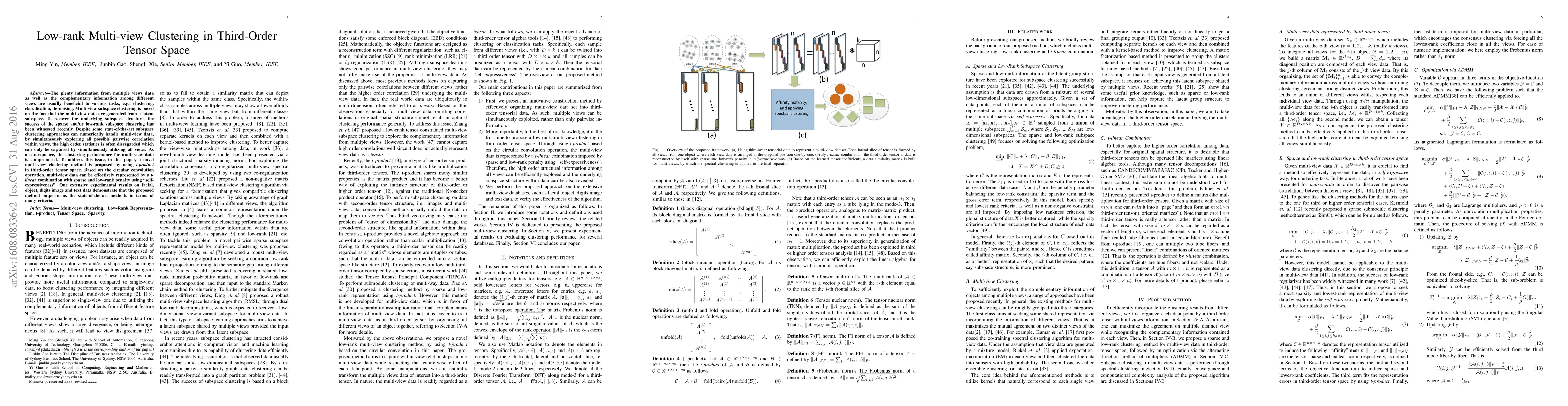 This paper proposes a novel multi-view clustering method using third-order tensor space and the t-product operation to capture high-order statistics among views, achieving better clustering performance compared to existing methods. The method employs a self-expressive t-linear combination with sparse and low-rank penalties, demonstrating superior results on various datasets.