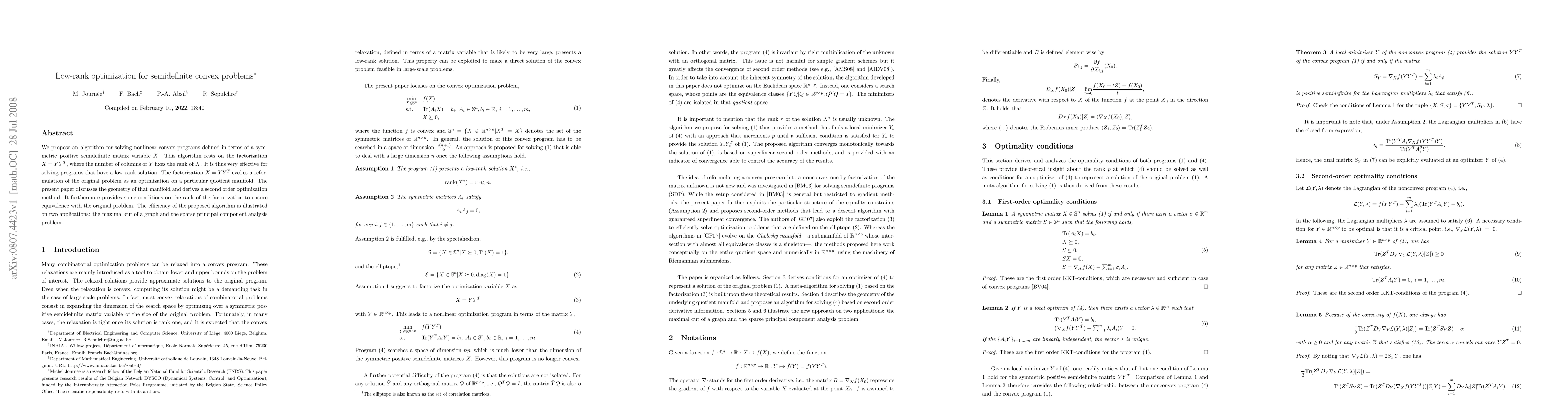 This paper proposes an algorithm for solving low-rank semidefinite convex optimization problems using a factorization $X=Y Y^T$. It reformulates the problem on a quotient manifold and derives a second-order optimization method, demonstrating efficiency in applications like maximal cut and sparse principal component analysis.