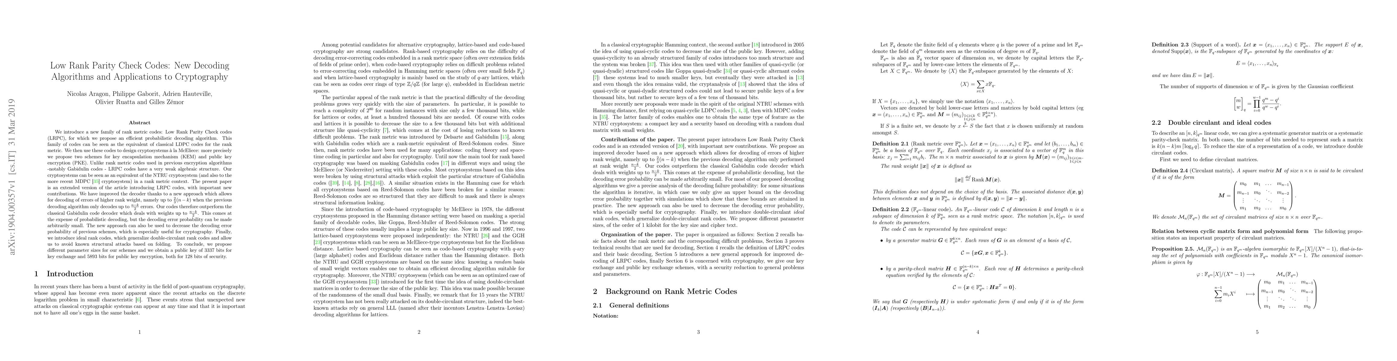 This paper introduces Low Rank Parity Check (LRPC) codes and presents a new probabilistic decoding algorithm that can handle higher rank weight errors compared to previous methods. The authors apply these codes to design novel cryptosystems with improved security and efficiency, achieving public keys of 3337 bits for key exchange and 5893 bits for public key encryption, both ensuring 128 bits of security.