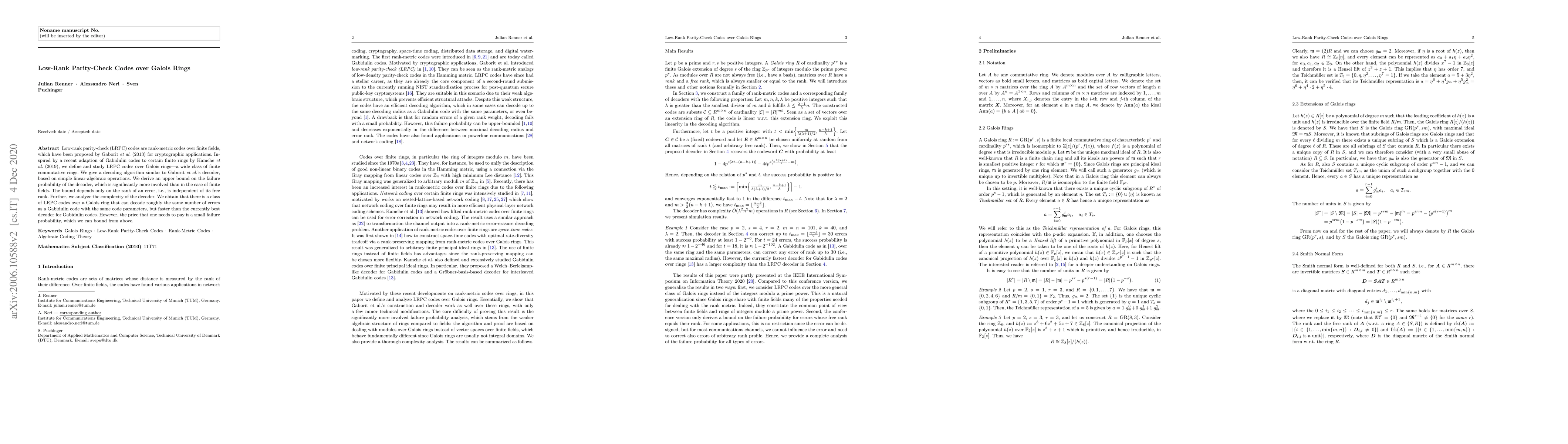 The paper adapts low-rank parity-check (LRPC) codes from finite fields to Galois rings, proposes a decoding algorithm, and derives bounds on failure probabilities for product, syndrome, and intersection conditions.