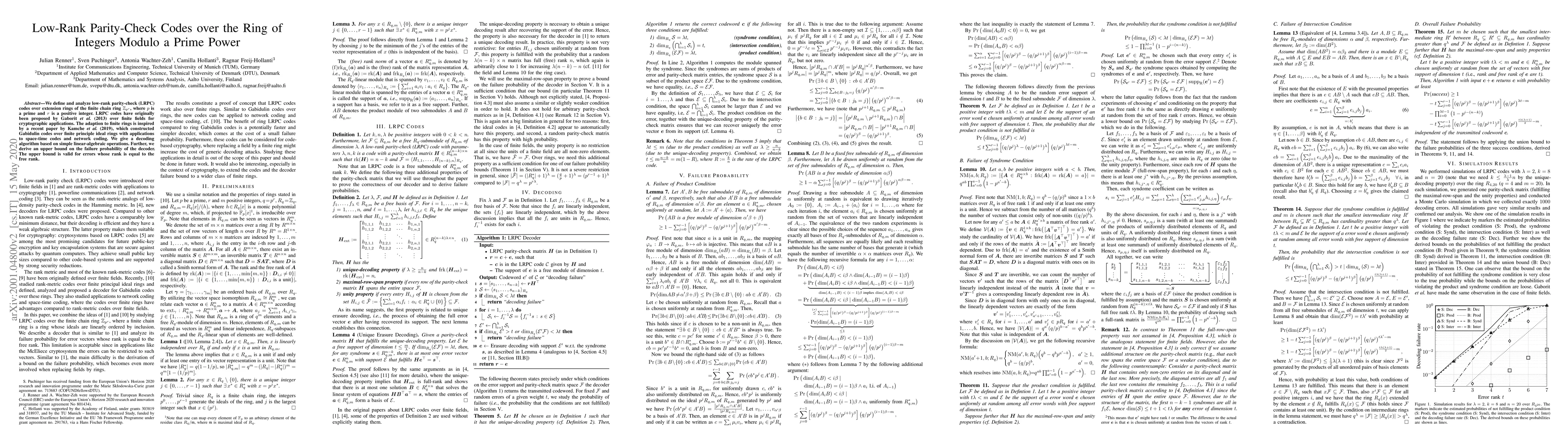 This paper introduces low-rank parity-check codes over the ring of integers modulo a prime power, extending the concept from finite fields to finite chain rings. It presents a decoding algorithm and derives an upper bound on the decoder's failure probability for errors matching the free rank.