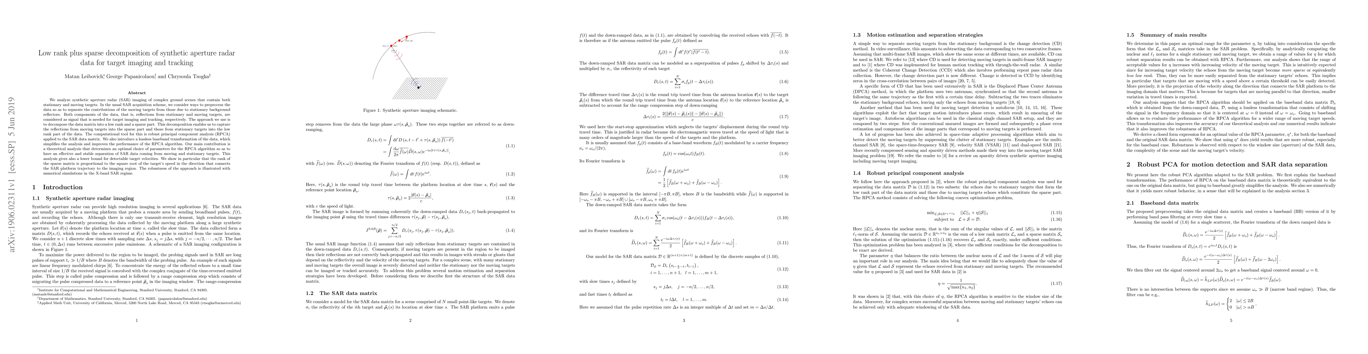 We analyze synthetic aperture radar (SAR) imaging of complex ground scenes that contain both stationary and moving targets. In the usual SAR acquisition scheme, we consider ways to preprocess the data so as to separate the contributions of the moving targets from those due to stationary background reflectors. Both components of the data, that is, reflections from stationary and moving targets, are considered as signal that is needed for target imaging and tracking, respectively. The approach we use is to decompose the data matrix into a low rank and a sparse part. This decomposition enables us to capture the reflections from moving targets into the sparse part and those from stationary targets into the low rank part of the data. The computational tool for this is robust principal component analysis (RPCA) applied to the SAR data matrix. We also introduce a lossless baseband transformation of the data, which simplifies the analysis and improves the performance of the RPCA algorithm. Our main contribution is a theoretical analysis that determines an optimal choice of parameters for the RPCA algorithm so as to have an effective and stable separation of SAR data coming from moving and stationary targets. This analysis gives also a lower bound for detectable target velocities. We show in particular that the rank of the sparse matrix is proportional to the square root of the target's speed in the direction that connects the SAR platform trajectory to the imaging region. The robustness of the approach is illustrated with numerical simulations in the X-band SAR regime.