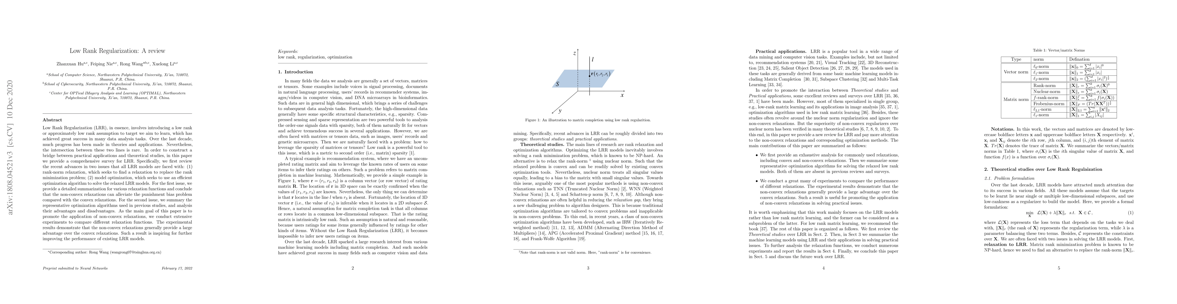 This paper provides a comprehensive review of low rank regularization, highlighting its applications in machine learning and practical issues like structure from motion and image denoising. It compares traditional regularizers and optimization methods, showing that non-convex regularizers often outperform the commonly used nuclear norm.