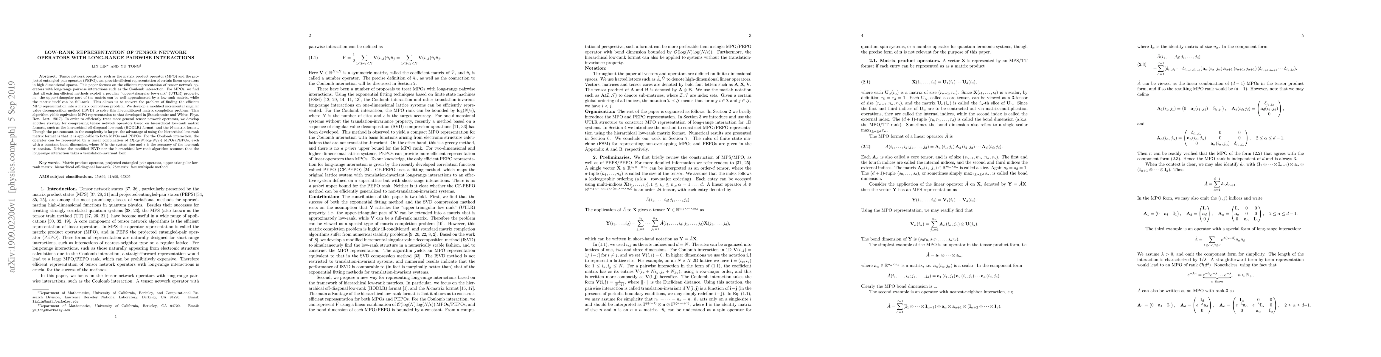 This paper presents efficient low-rank representations for tensor network operators, specifically MPOs and PEPOs, with long-range pairwise interactions like the Coulomb interaction. It introduces a modified ISVD algorithm to exploit the upper-triangular low-rank property and a hierarchical low-rank matrix format for broader applicability.