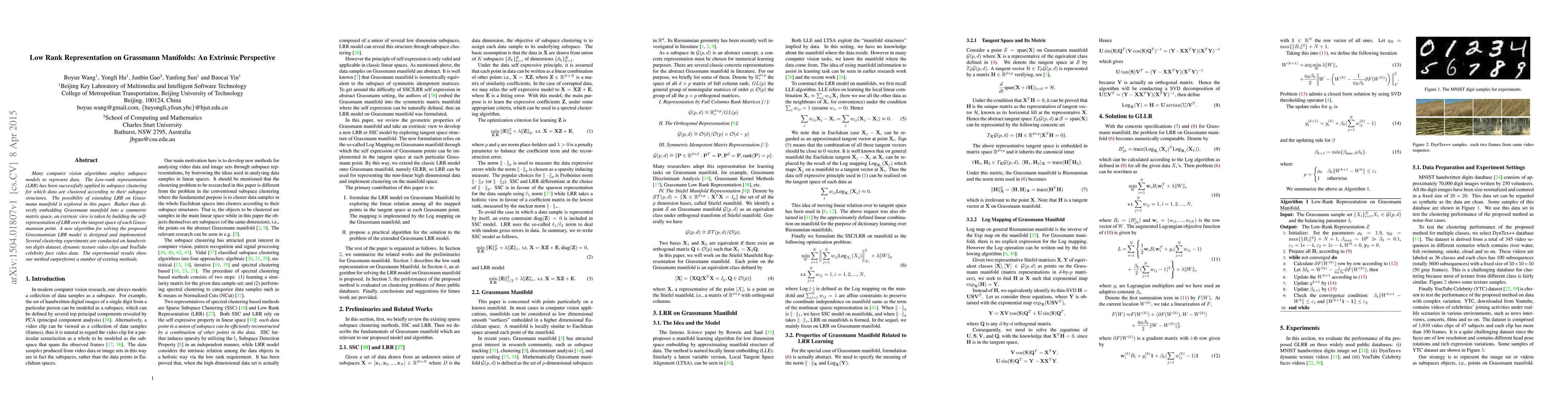 This paper proposes an extrinsic approach to extend Low-Rank Representation (LRR) to Grassmann manifolds by constructing self-representations over the tangent space of each Grassmannian point. Experimental results on various datasets demonstrate the superior performance of the proposed method over existing techniques.