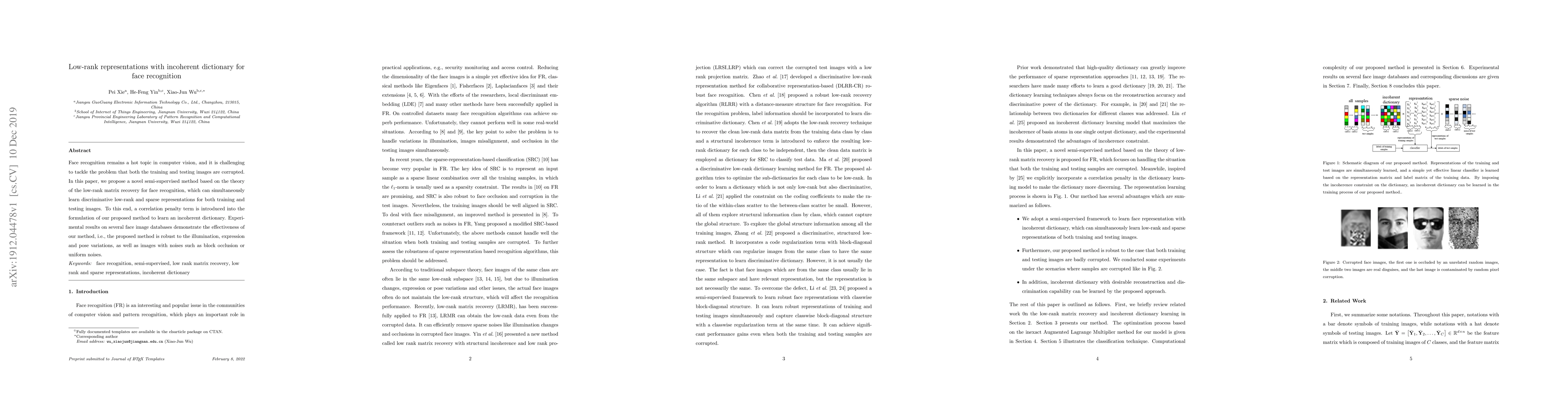 This paper proposes a semi-supervised face recognition method based on low-rank matrix recovery, which learns discriminative low-rank and sparse representations. The method introduces a correlation penalty term to develop an incoherent dictionary, demonstrating robustness to variations and noise in face images.