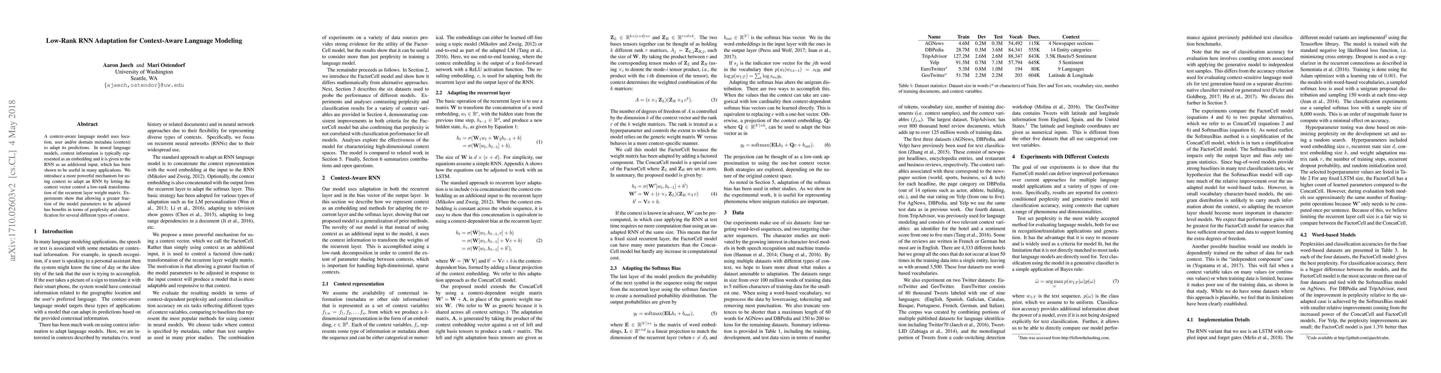 A context-aware language model uses location, user and/or domain metadata (context) to adapt its predictions. In neural language models, context information is typically represented as an embedding and it is given to the RNN as an additional input, which has been shown to be useful in many applications. We introduce a more powerful mechanism for using context to adapt an RNN by letting the context vector control a low-rank transformation of the recurrent layer weight matrix. Experiments show that allowing a greater fraction of the model parameters to be adjusted has benefits in terms of perplexity and classification for several different types of context.