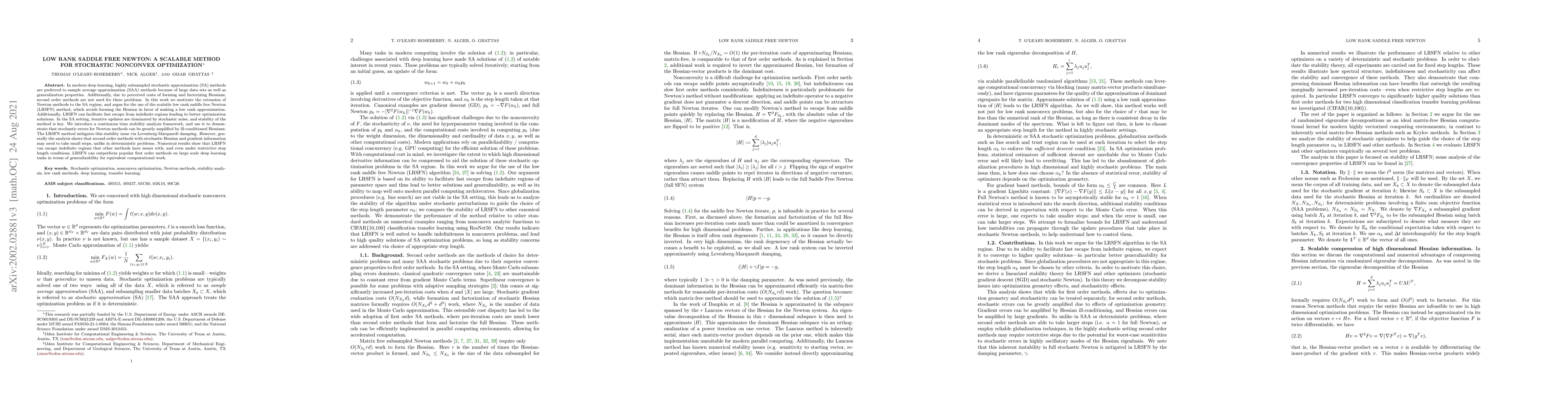 In modern deep learning, highly subsampled stochastic approximation (SA) methods are preferred to sample average approximation (SAA) methods because of large data sets as well as generalization properties. Additionally, due to perceived costs of forming and factorizing Hessians, second order methods are not used for these problems. In this work we motivate the extension of Newton methods to the SA regime, and argue for the use of the scalable low rank saddle free Newton (LRSFN) method, which avoids forming the Hessian in favor of making a low rank approximation. Additionally, LRSFN can facilitate fast escape from indefinite regions leading to better optimization solutions. In the SA setting, iterative updates are dominated by stochastic noise, and stability of the method is key. We introduce a continuous time stability analysis framework, and use it to demonstrate that stochastic errors for Newton methods can be greatly amplified by ill-conditioned Hessians. The LRSFN method mitigates this stability issue via Levenberg-Marquardt damping. However, generally the analysis shows that second order methods with stochastic Hessian and gradient information may need to take small steps, unlike in deterministic problems. Numerical results show that LRSFN can escape indefinite regions that other methods have issues with; and even under restrictive step length conditions, LRSFN can outperform popular first order methods on large scale deep learning tasks in terms of generalizability for equivalent computational work.