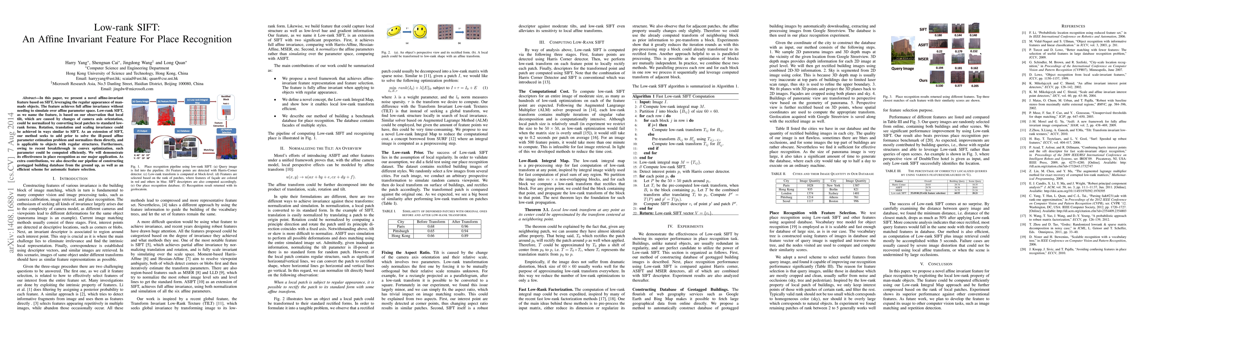 In this paper, we present a novel affine-invariant feature based on SIFT, leveraging the regular appearance of man-made objects. The feature achieves full affine invariance without needing to simulate over affine parameter space. Low-rank SIFT, as we name the feature, is based on our observation that local tilt, which are caused by changes of camera axis orientation, could be normalized by converting local patches to standard low-rank forms. Rotation, translation and scaling invariance could be achieved in ways similar to SIFT. As an extension of SIFT, our method seeks to add prior to solve the ill-posed affine parameter estimation problem and normalizes them directly, and is applicable to objects with regular structures. Furthermore, owing to recent breakthrough in convex optimization, such parameter could be computed efficiently. We will demonstrate its effectiveness in place recognition as our major application. As extra contributions, we also describe our pipeline of constructing geotagged building database from the ground up, as well as an efficient scheme for automatic feature selection.