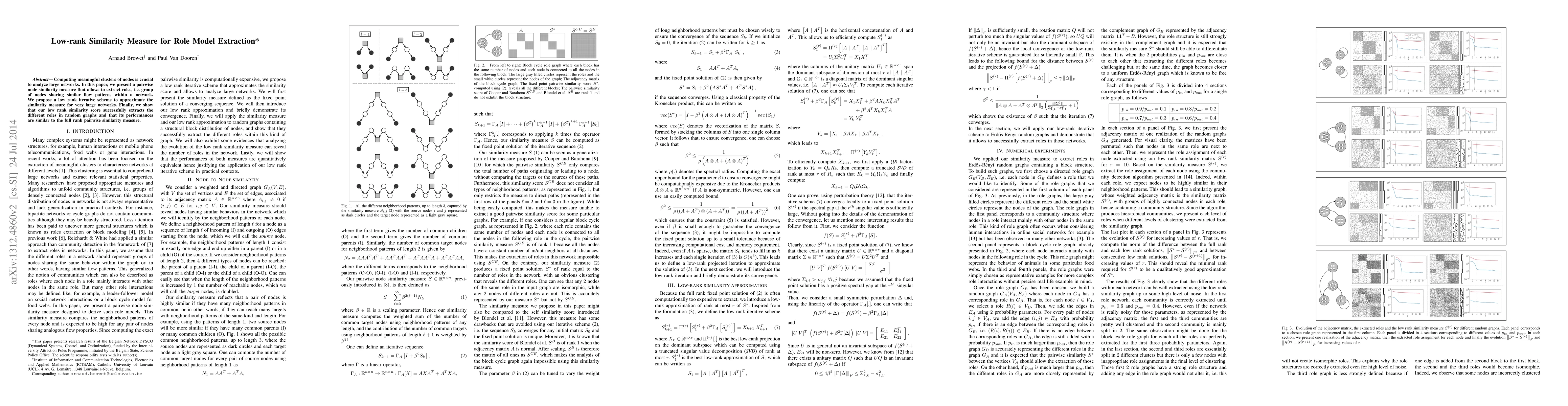 This paper introduces a low-rank similarity measure for extracting roles in large networks by identifying groups of nodes sharing similar flow patterns. The proposed low-rank iterative scheme approximates the similarity measure efficiently and demonstrates comparable performance to traditional pairwise measures in random graphs.