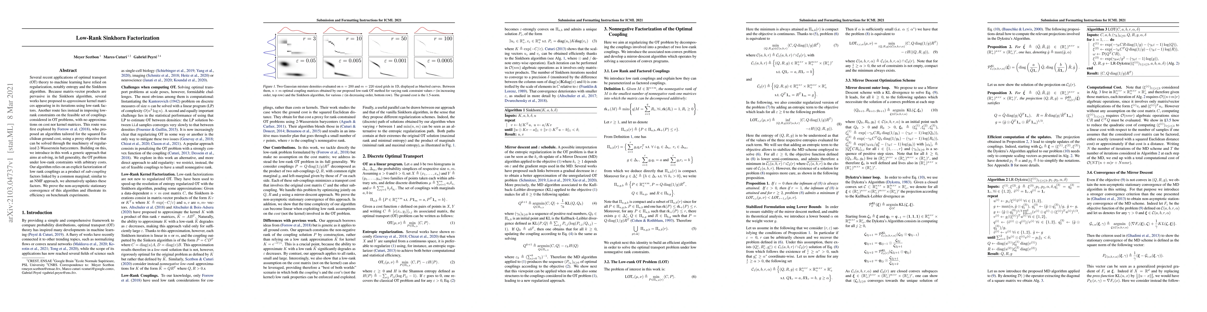 This paper proposes a novel low-rank Sinkhorn factorization method for solving optimal transport problems under low-rank constraints, offering an explicit factorization of couplings into sub-coupling factors. The method is shown to converge and is demonstrated to be efficient on benchmark experiments.